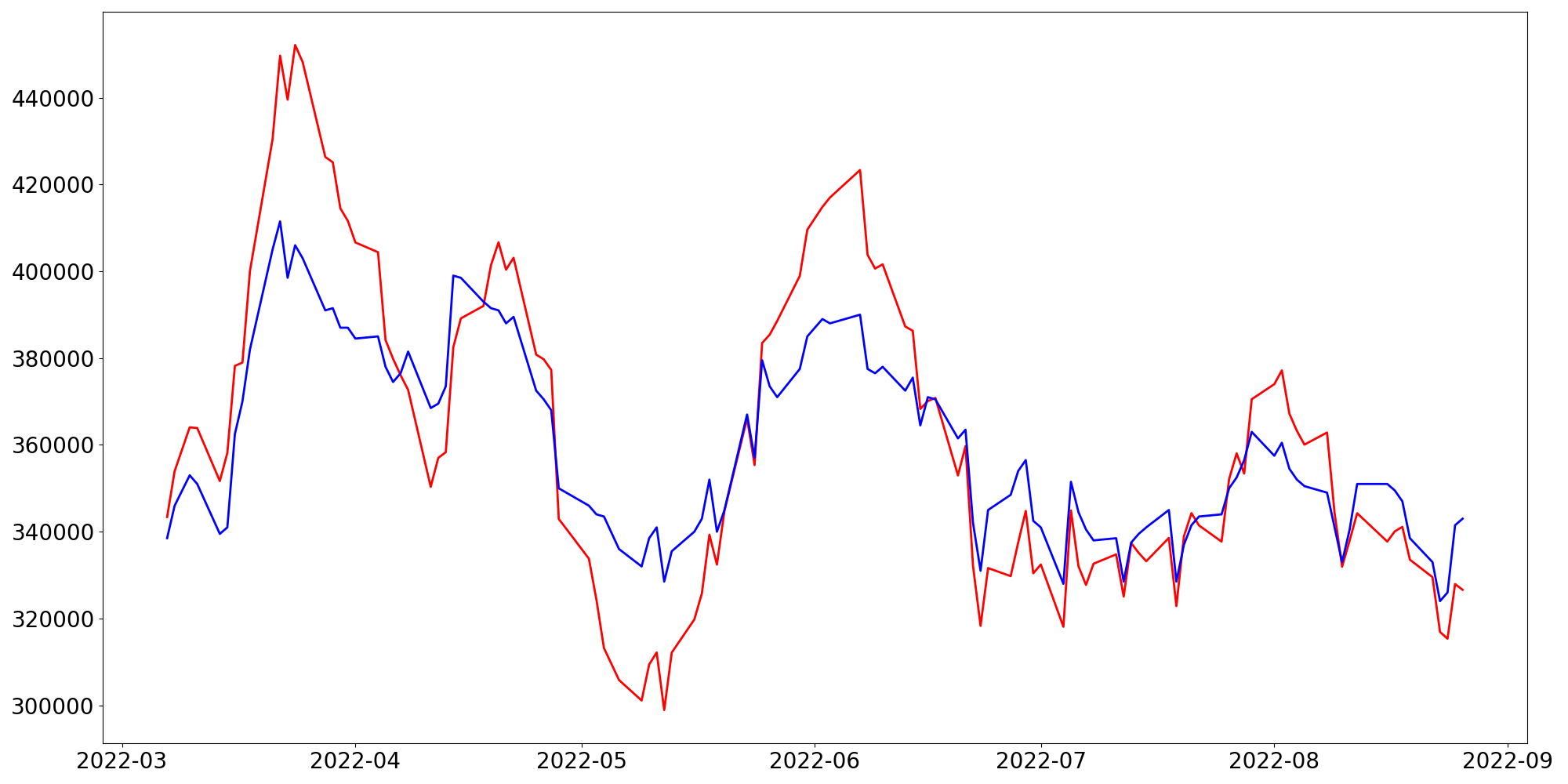 [ - : 실제값(종가) / - : 예측값(종가) ]