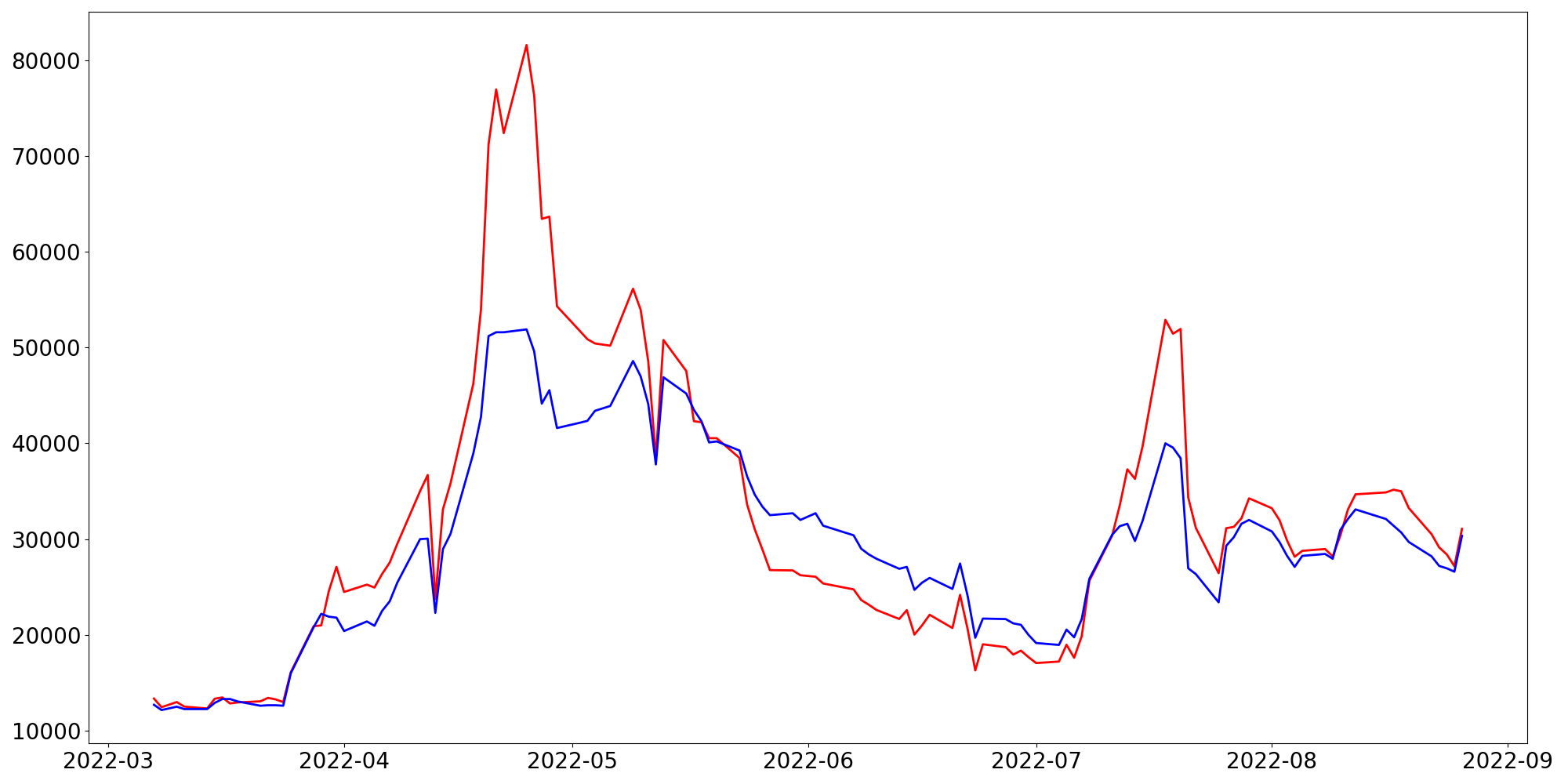 [ - : 실제값(종가) / - : 예측값(종가) ]