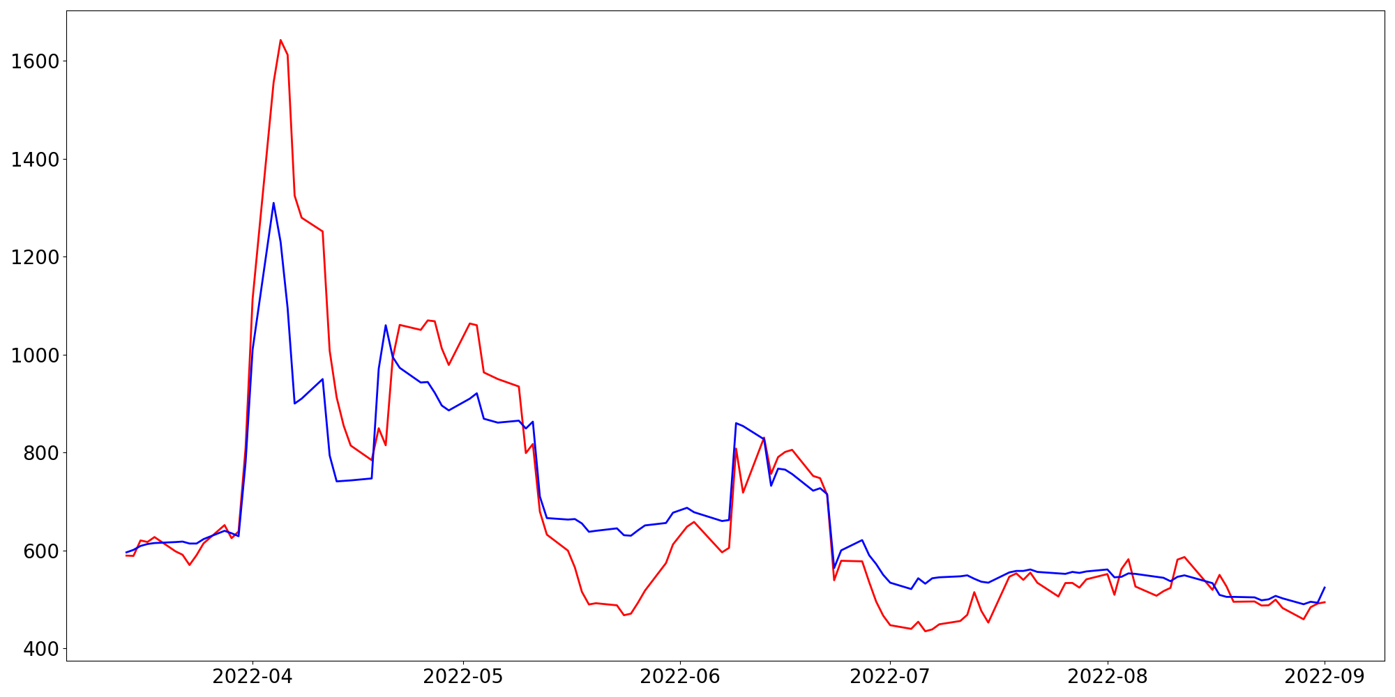 [ - : 실제값(종가) / - : 예측값(종가) ]