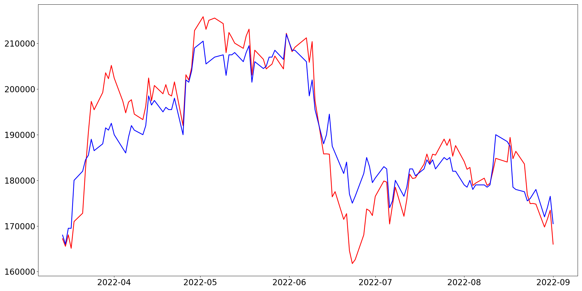 [ - : 실제값(종가) / - : 예측값(종가) ]