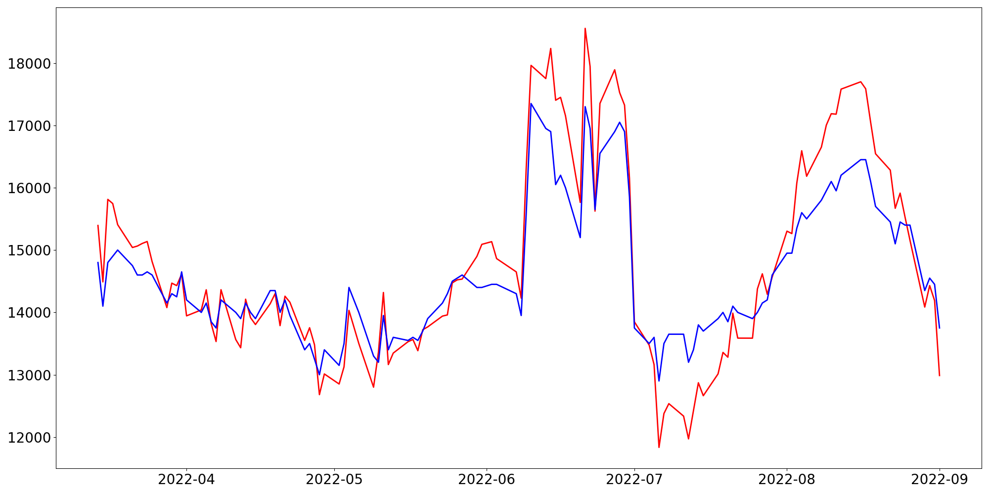 [ - : 실제값(종가) / - : 예측값(종가) ]