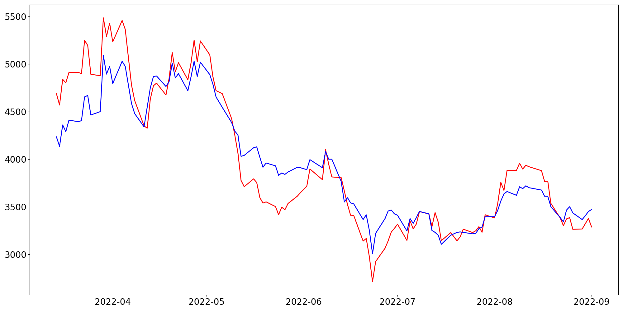 [ - : 실제값(종가) / - : 예측값(종가) ]