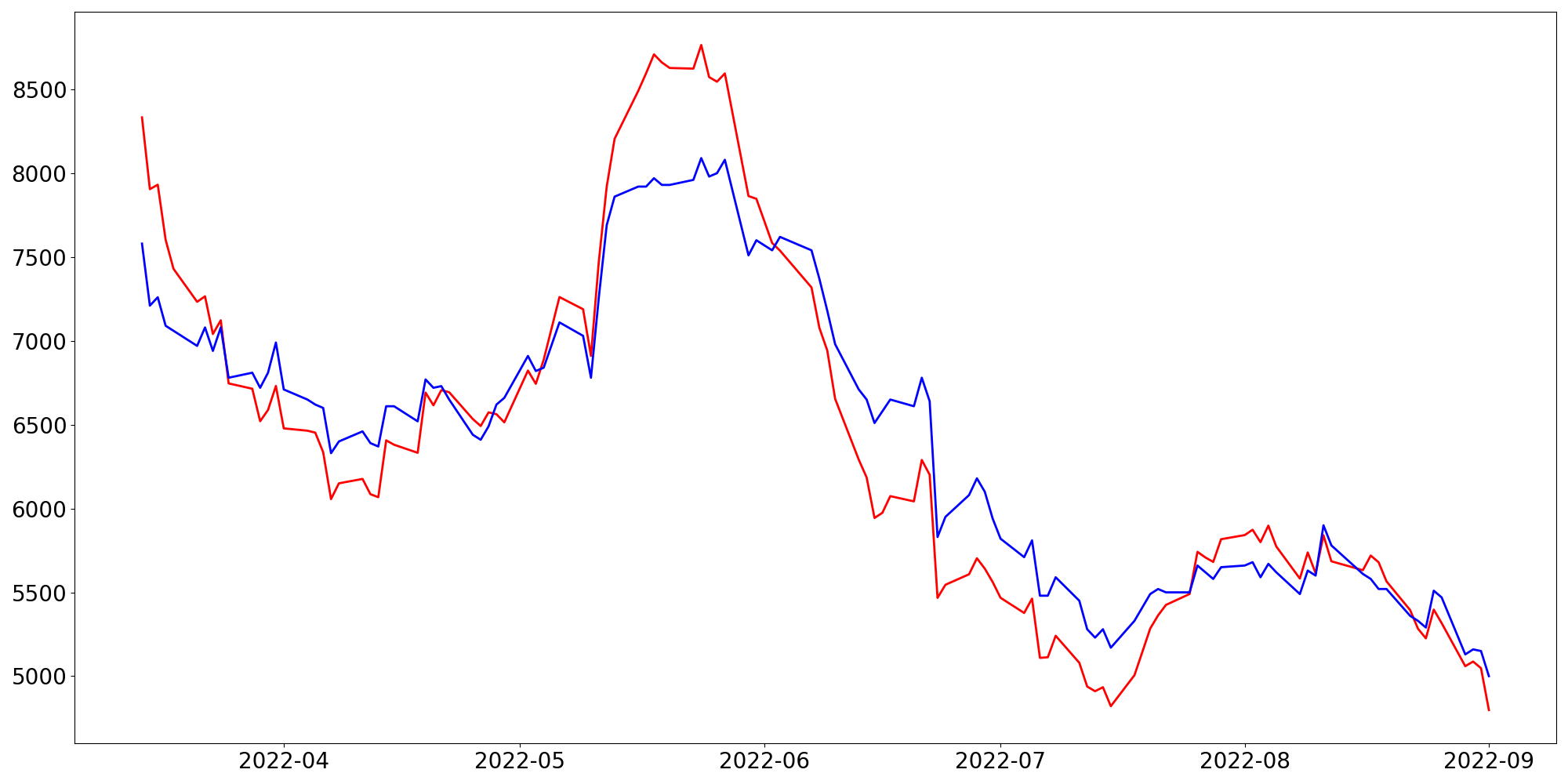 [ - : 실제값(종가) / - : 예측값(종가) ]