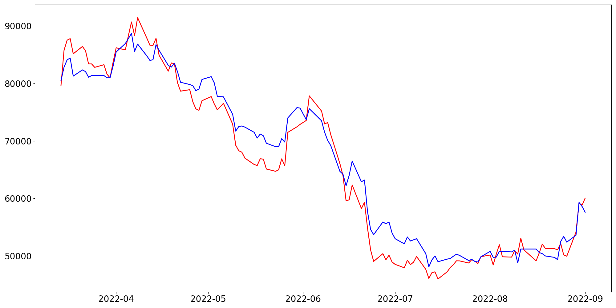 [ - : 실제값(종가) / - : 예측값(종가) ]