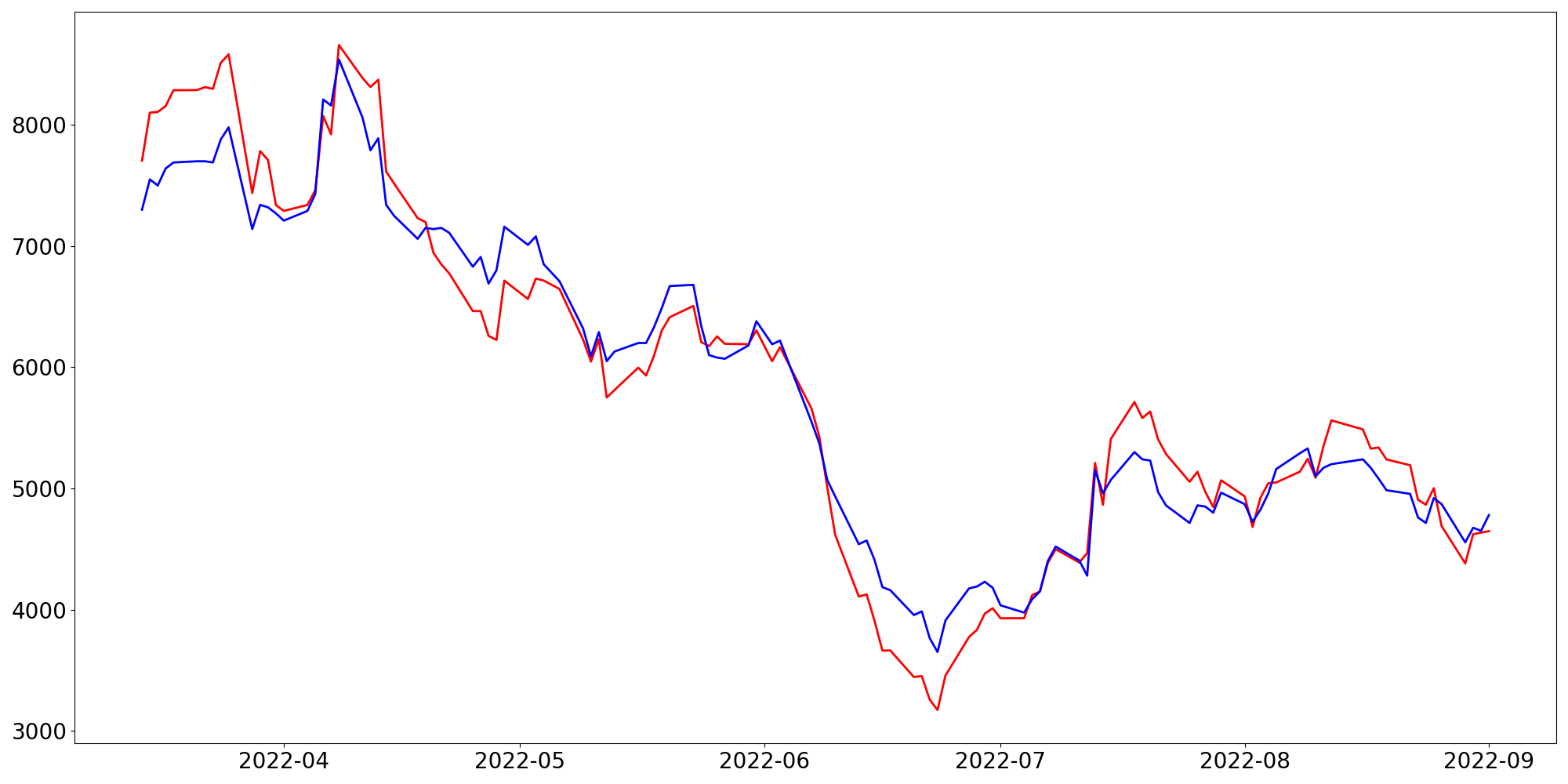 [ - : 실제값(종가) / - : 예측값(종가) ]