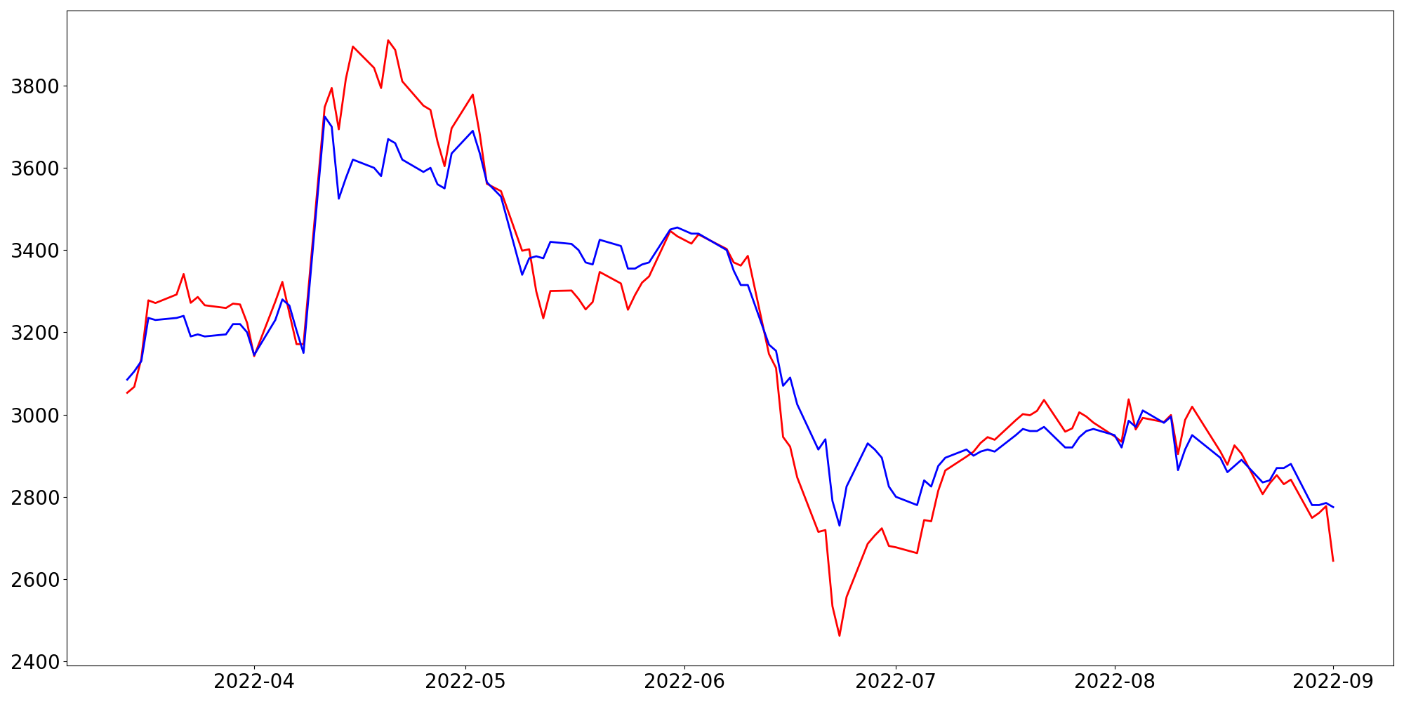 [ - : 실제값(종가) / - : 예측값(종가) ]