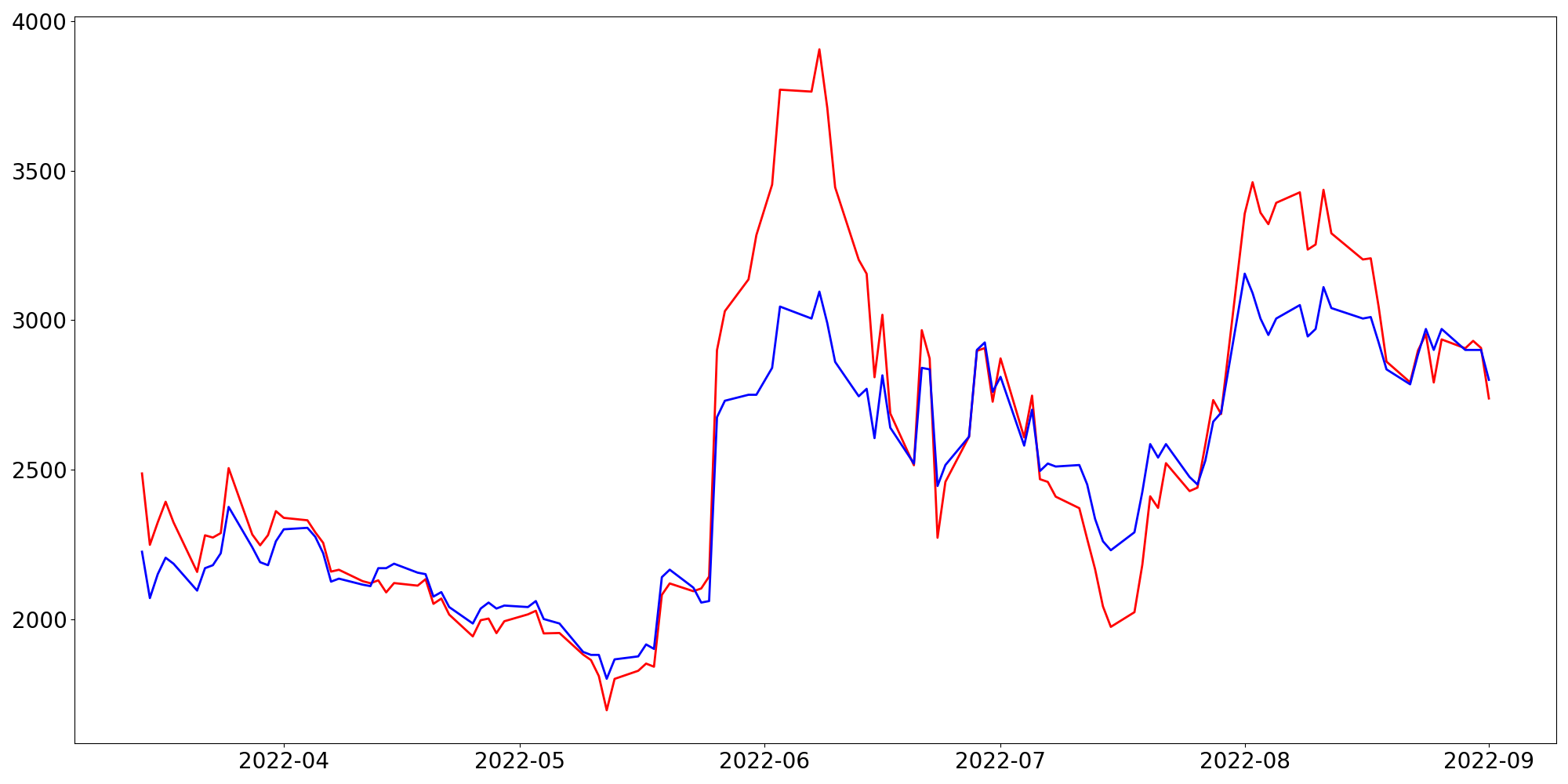 [ - : 실제값(종가) / - : 예측값(종가) ]