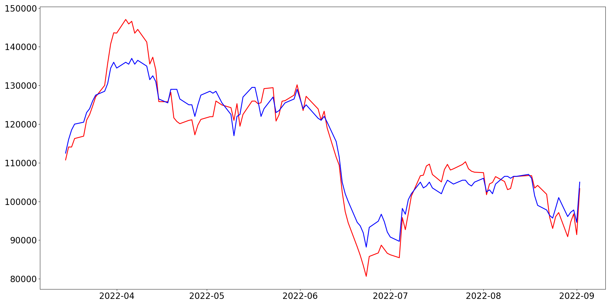 [ - : 실제값(종가) / - : 예측값(종가) ]