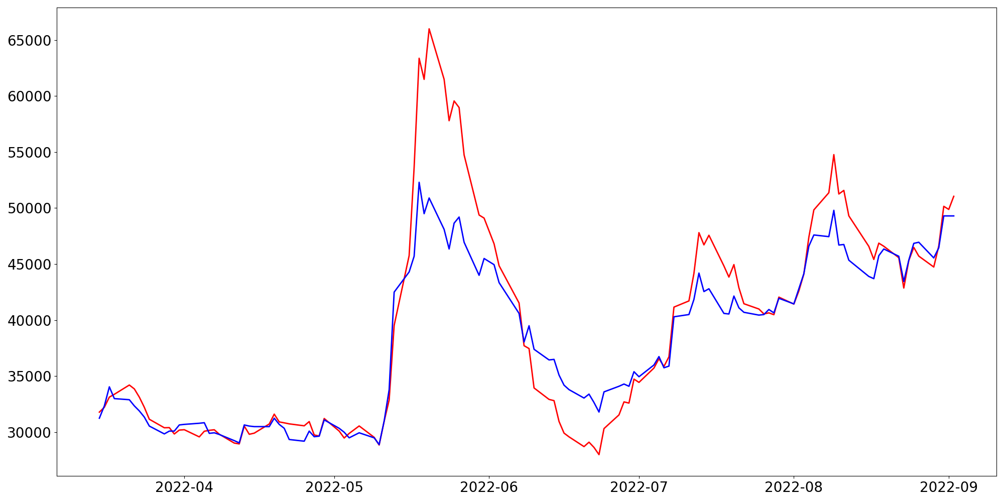 [ - : 실제값(종가) / - : 예측값(종가) ]