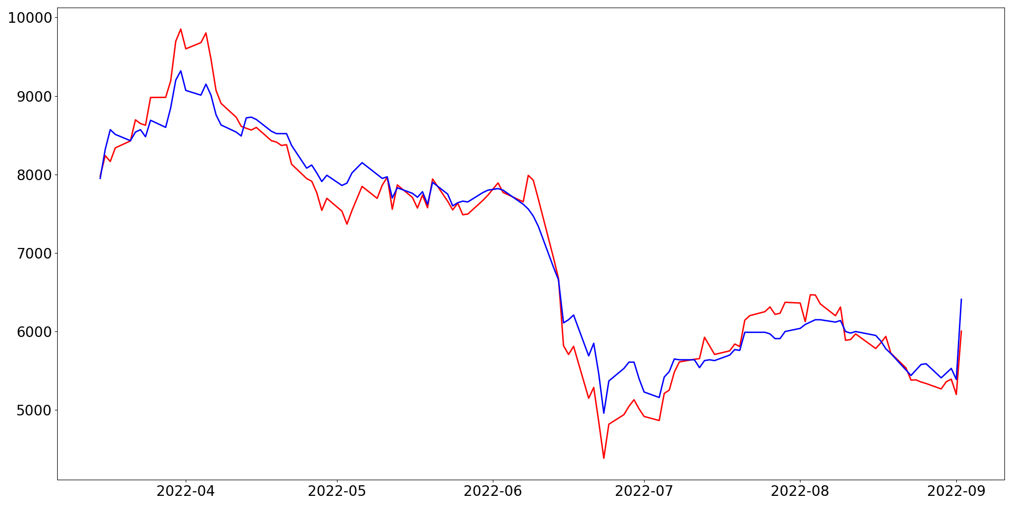 [ - : 실제값(종가) / - : 예측값(종가) ]