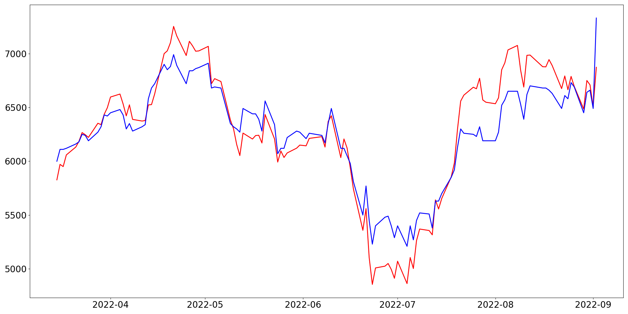 [ - : 실제값(종가) / - : 예측값(종가) ]