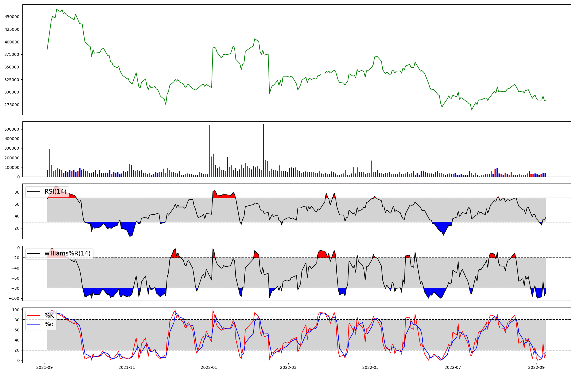 □ 중기 : 현재 종가가 중기(60일) 이동평균값(291,867원)을 하회 하여 중기적 추세 하락 중
