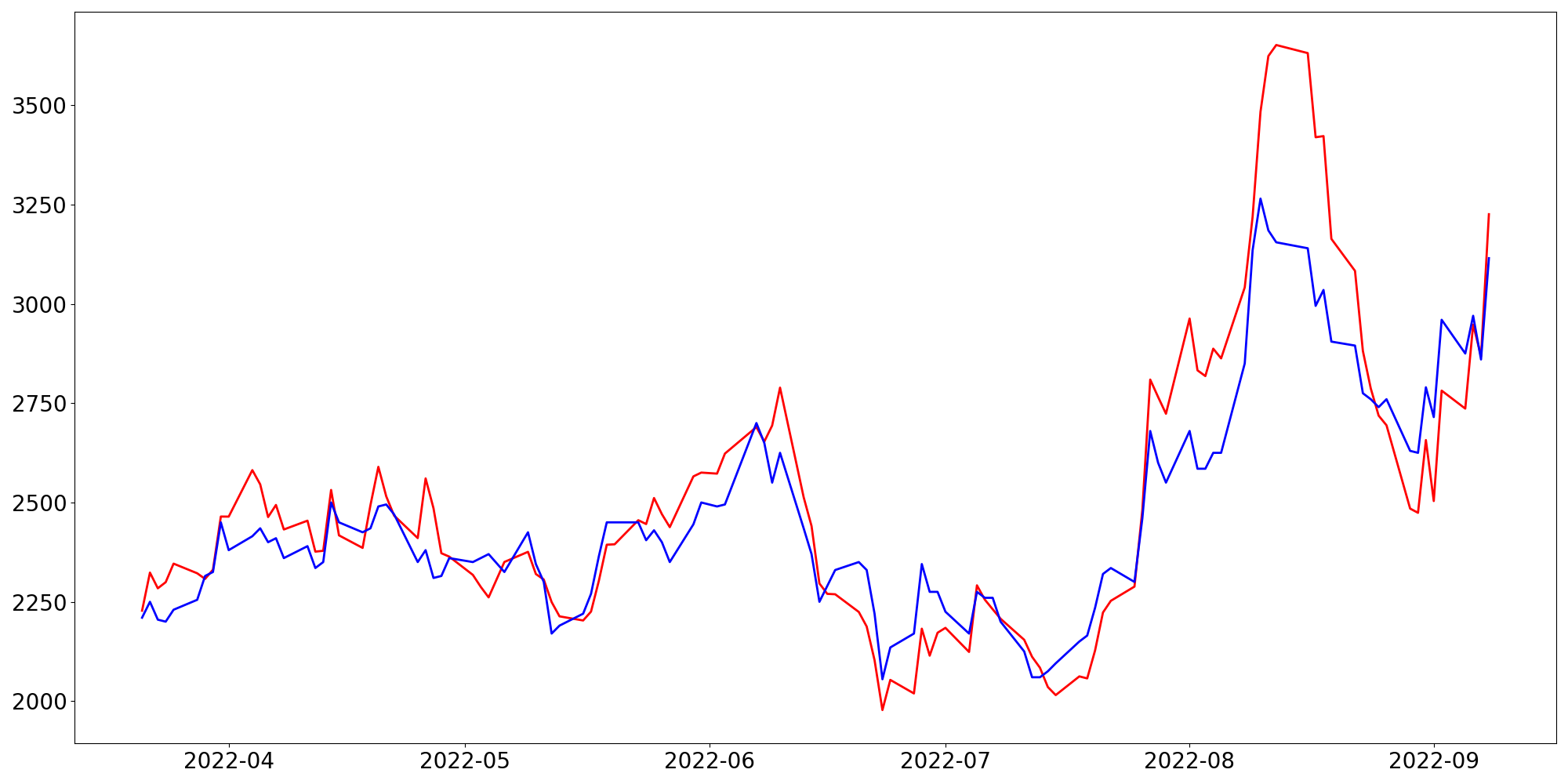 [ - : 실제값(종가) / - : 예측값(종가) ]