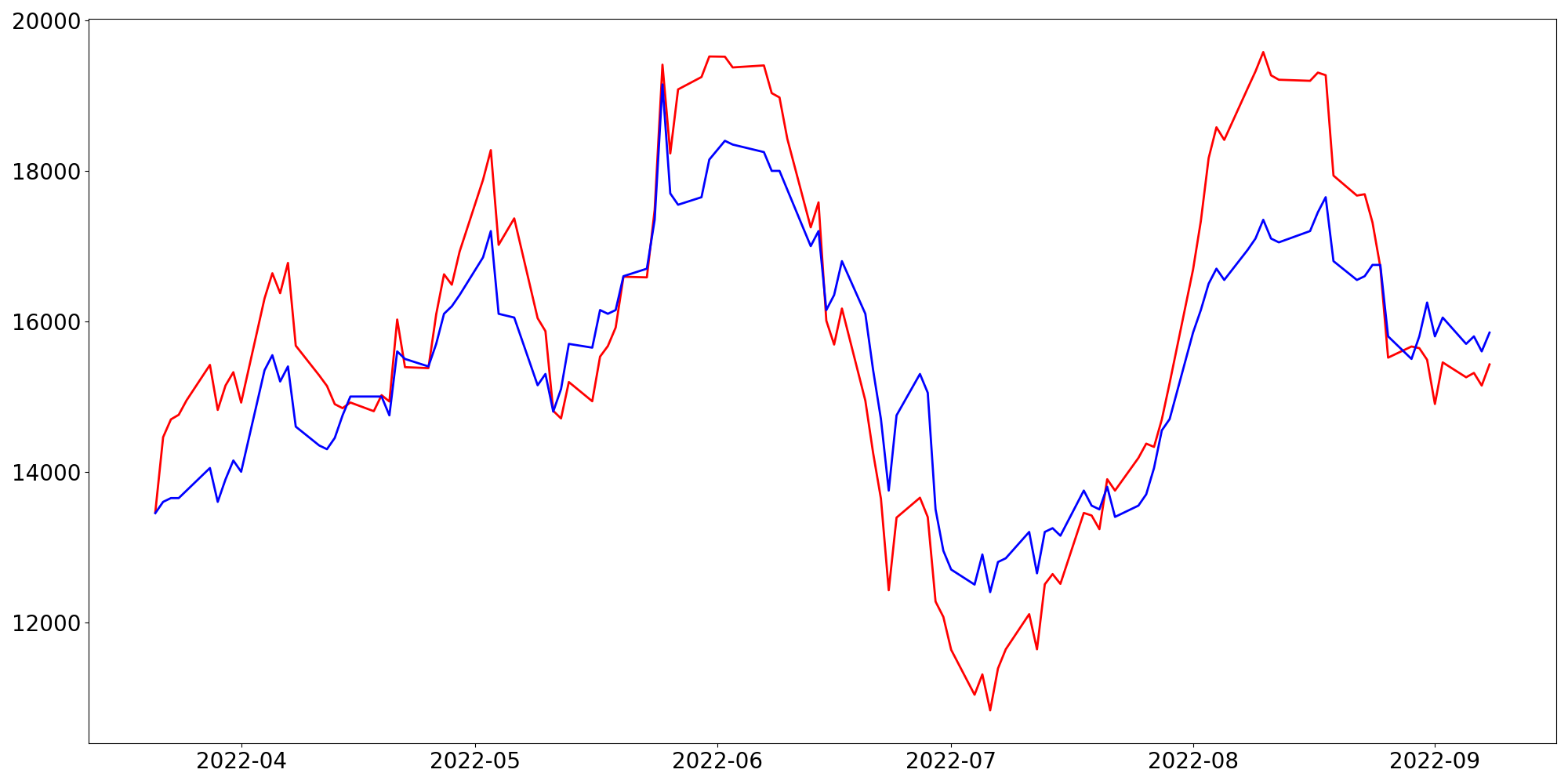 [ - : 실제값(종가) / - : 예측값(종가) ]