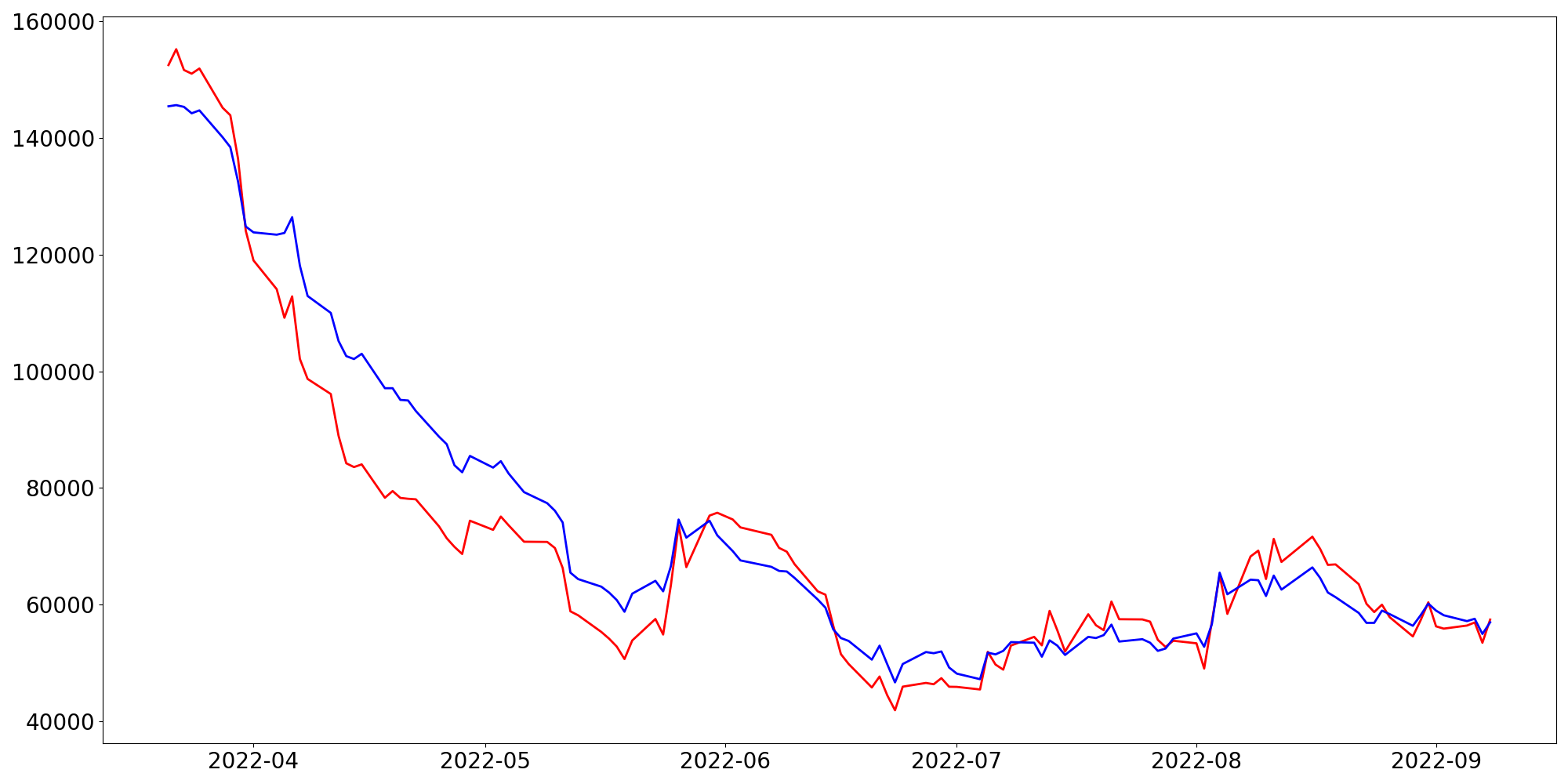 [ - : 실제값(종가) / - : 예측값(종가) ]