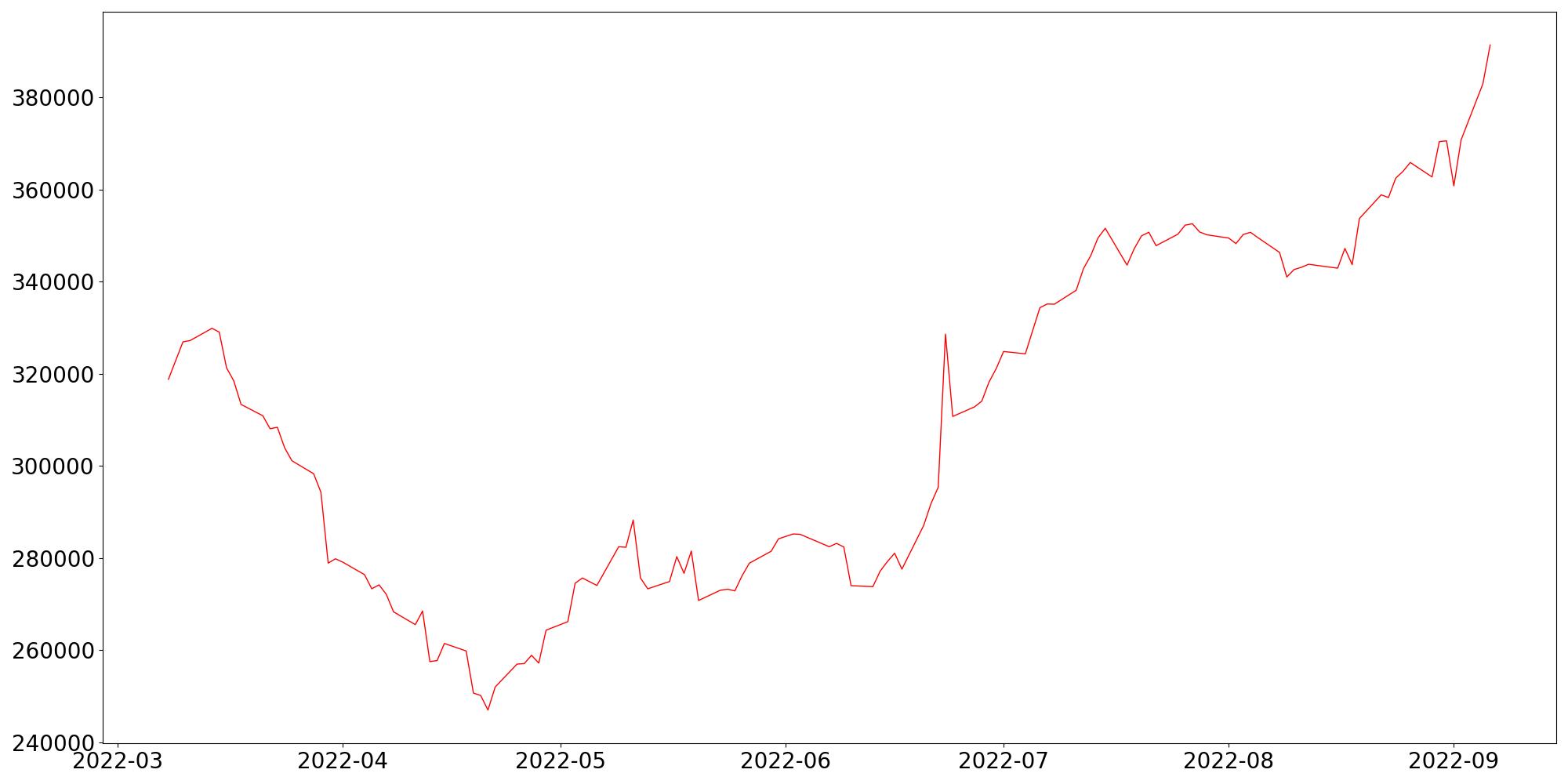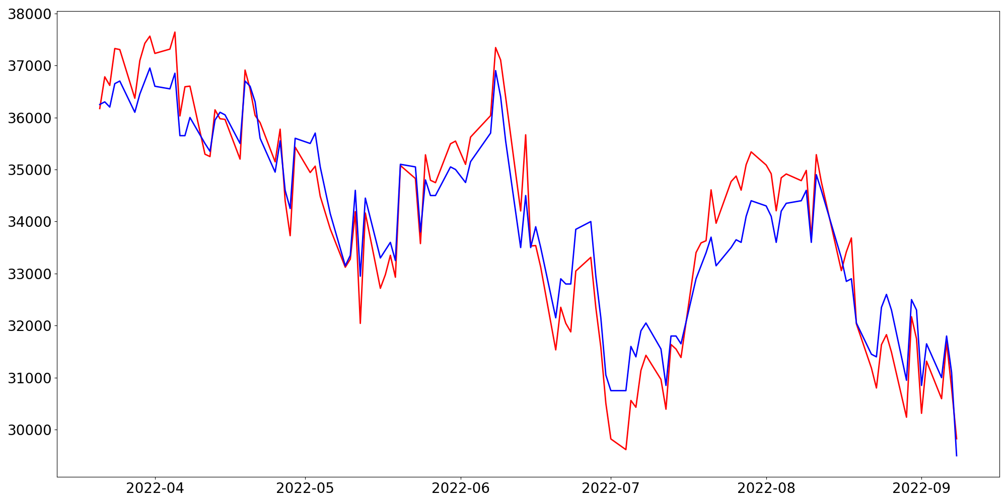 [ - : 실제값(종가) / - : 예측값(종가) ]