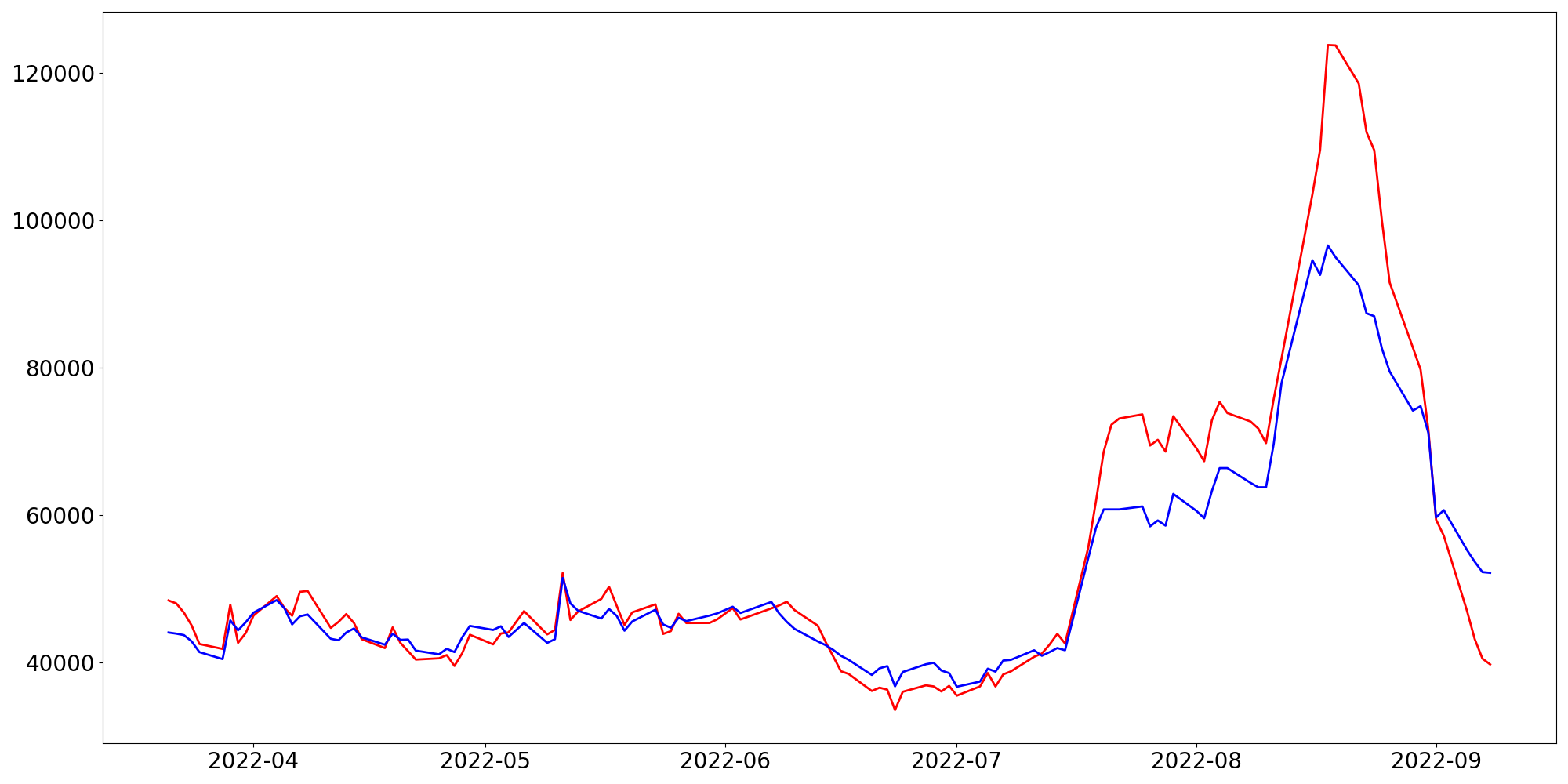 [ - : 실제값(종가) / - : 예측값(종가) ]