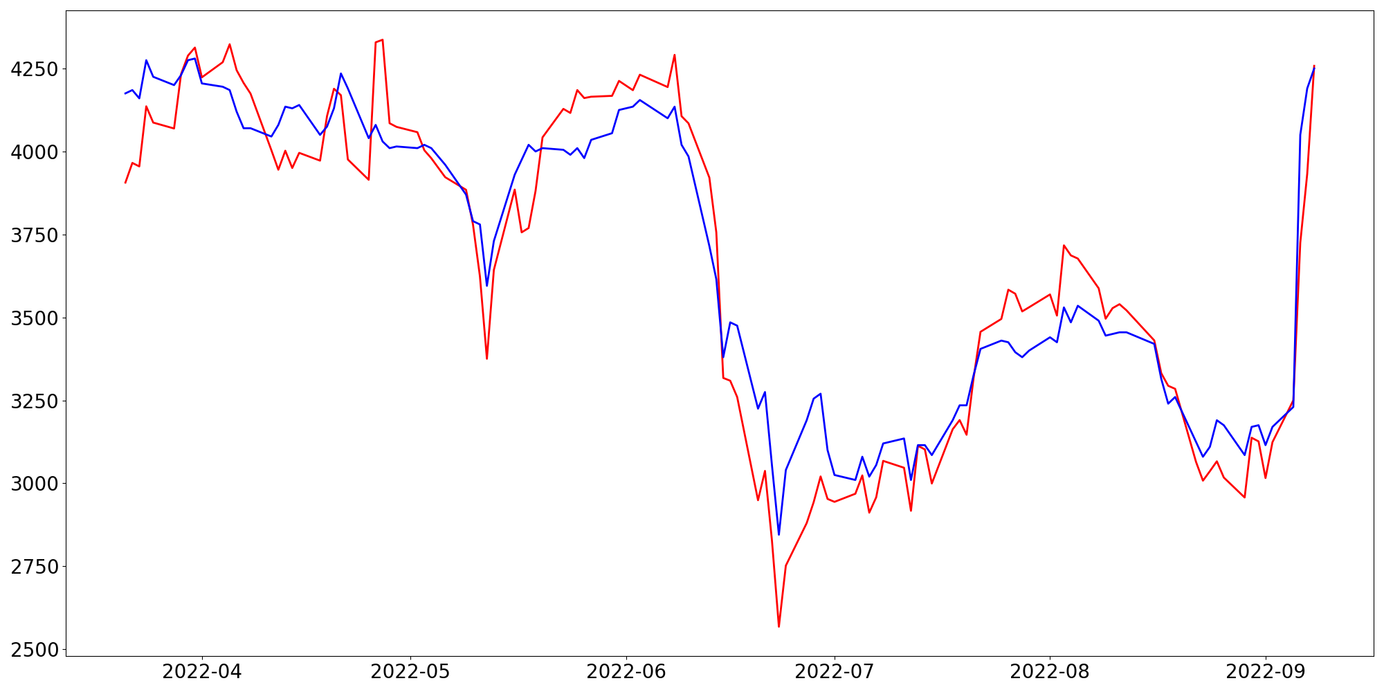 [ - : 실제값(종가) / - : 예측값(종가) ]