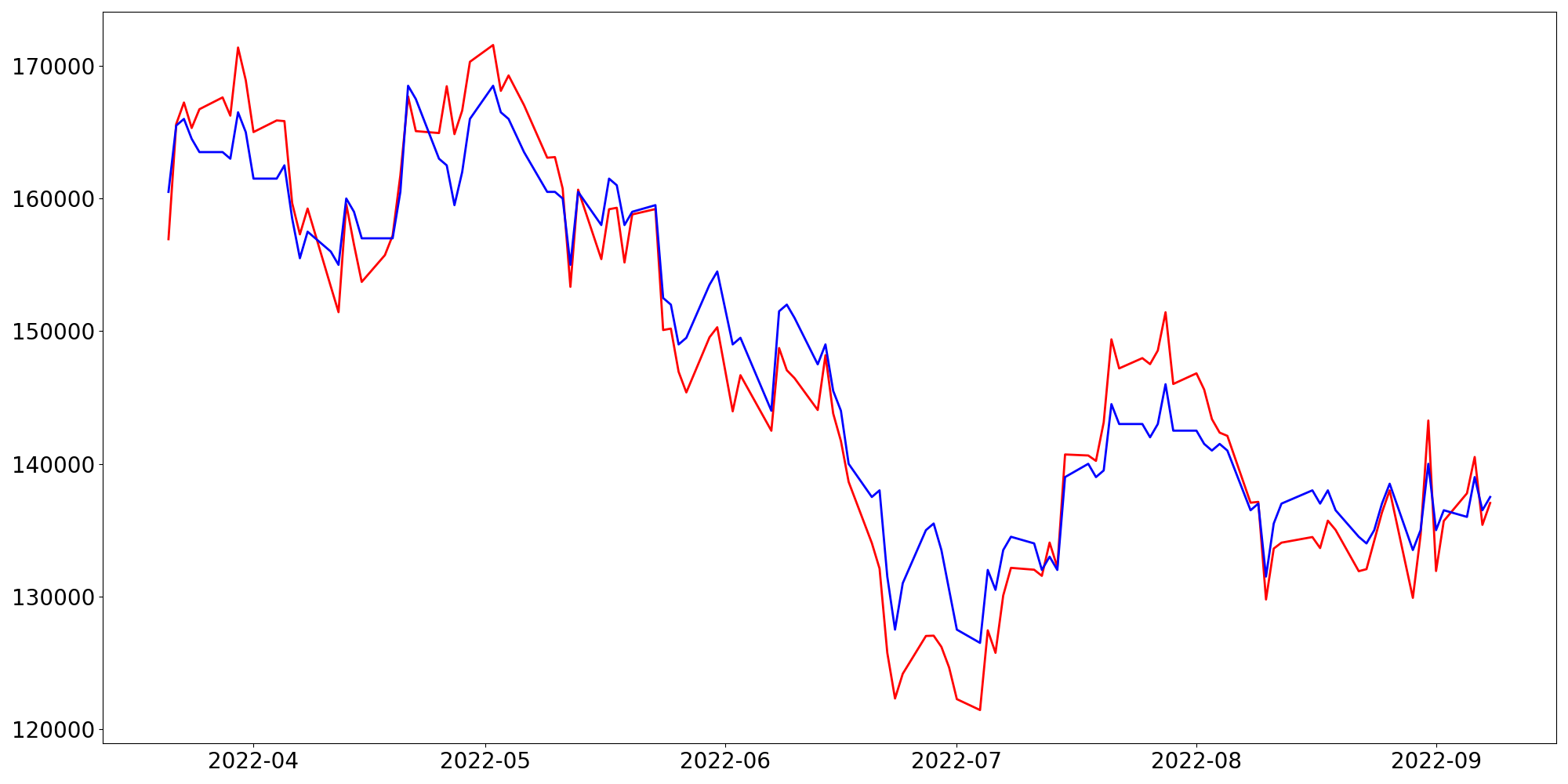 [ - : 실제값(종가) / - : 예측값(종가) ]