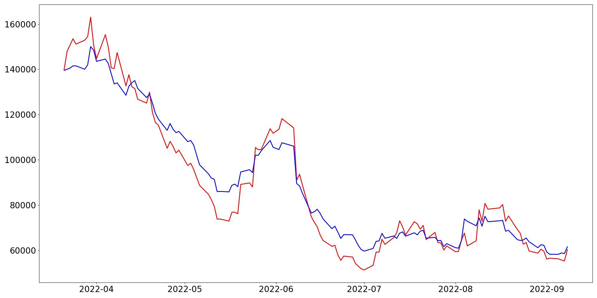 [ - : 실제값(종가) / - : 예측값(종가) ]