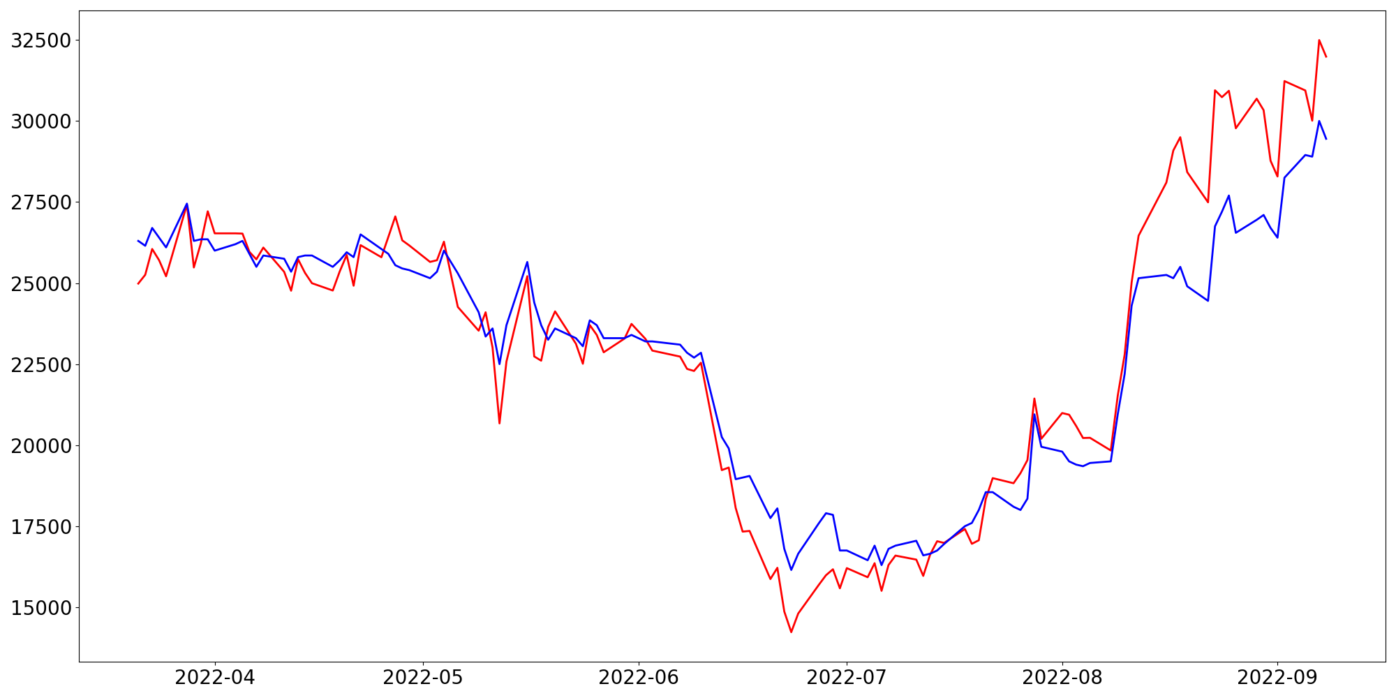 [ - : 실제값(종가) / - : 예측값(종가) ]