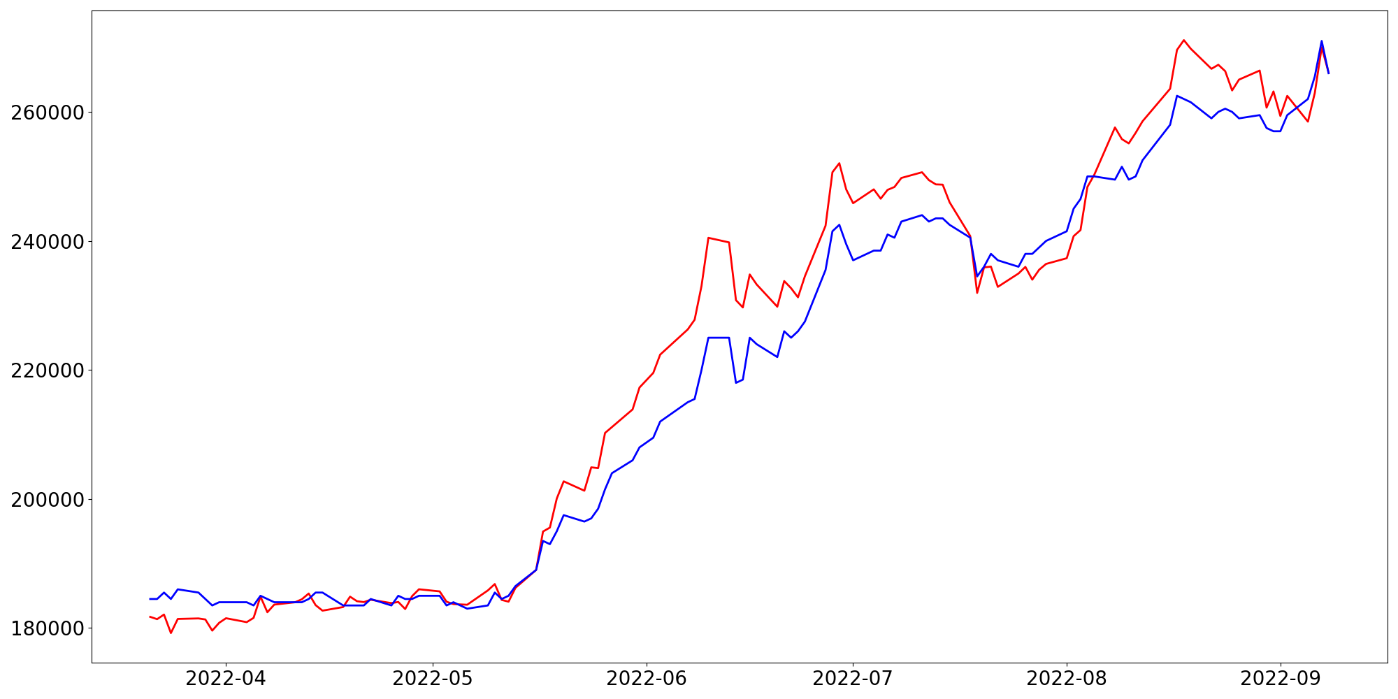 [ - : 실제값(종가) / - : 예측값(종가) ]