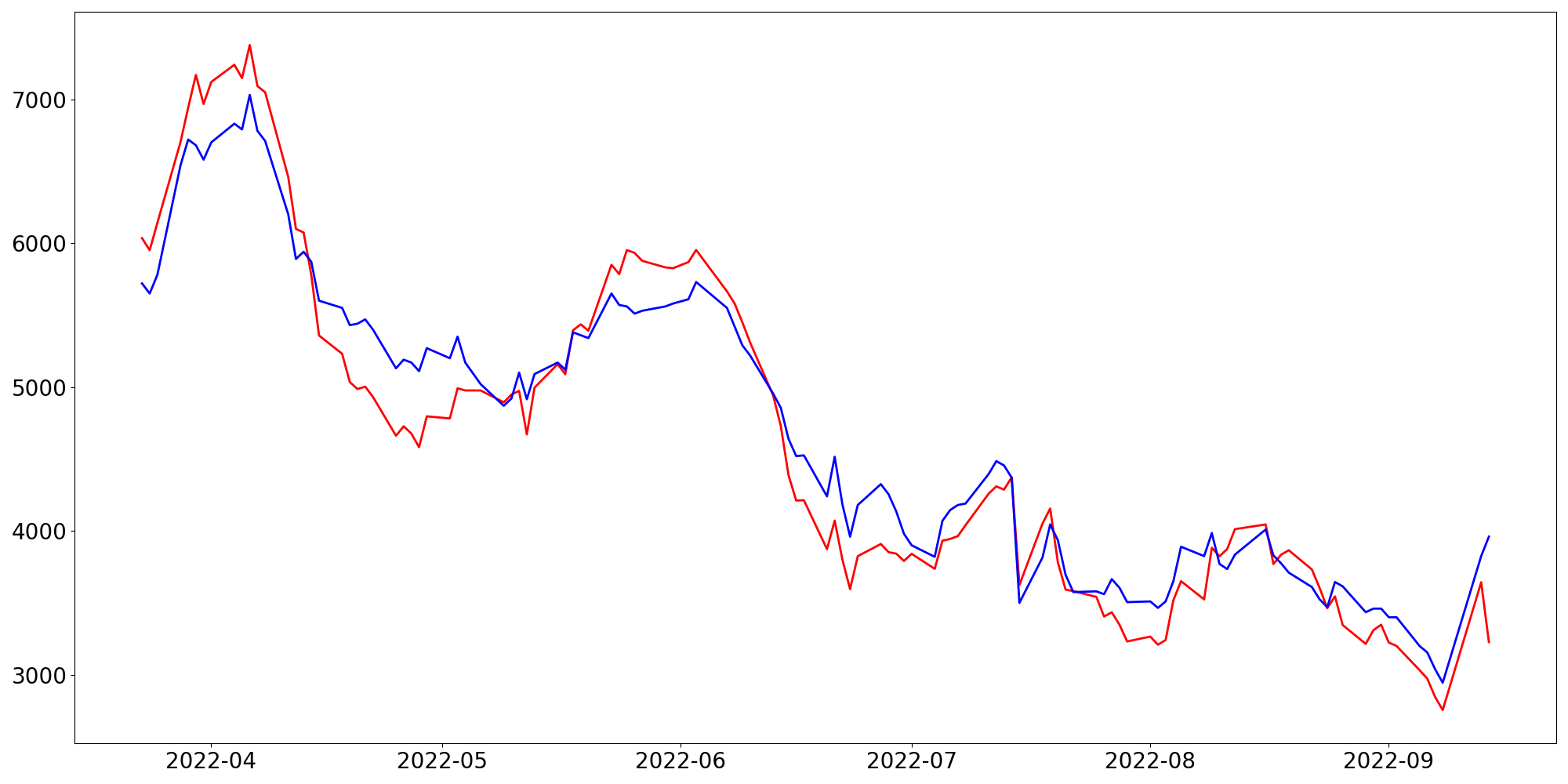 [ - : 실제값(종가) / - : 예측값(종가) ]