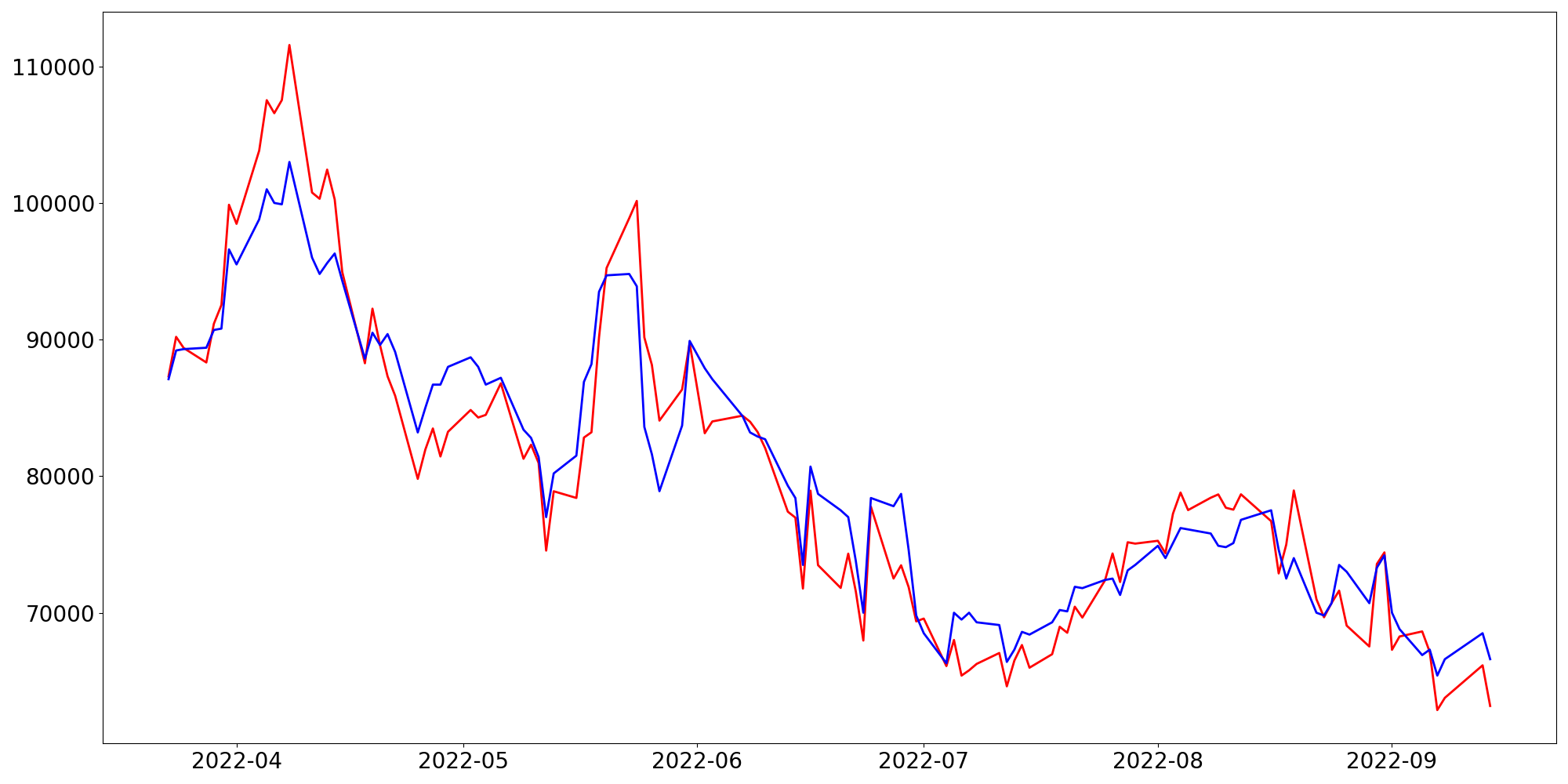[ - : 실제값(종가) / - : 예측값(종가) ]