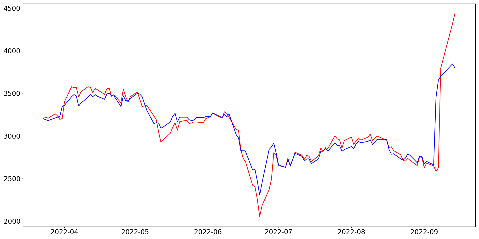 [ - : 실제값(종가) / - : 예측값(종가) ]