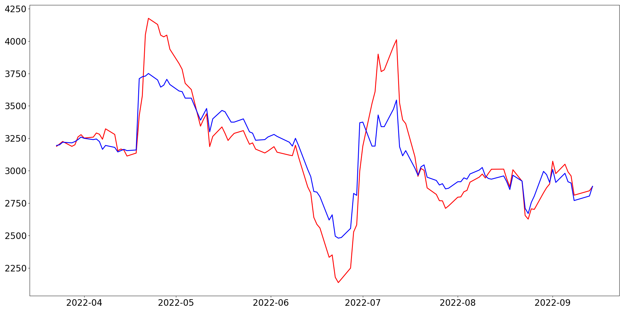 [ - : 실제값(종가) / - : 예측값(종가) ]