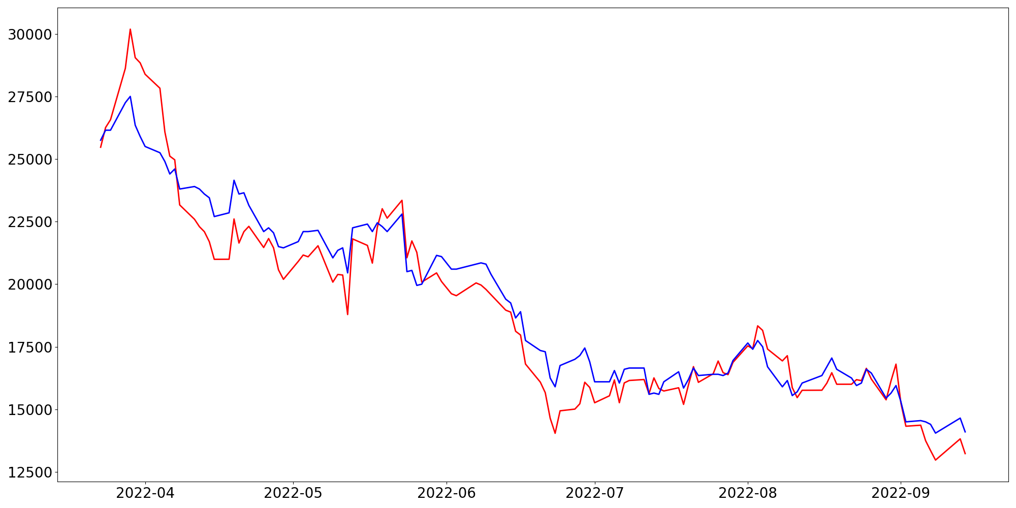 [ - : 실제값(종가) / - : 예측값(종가) ]