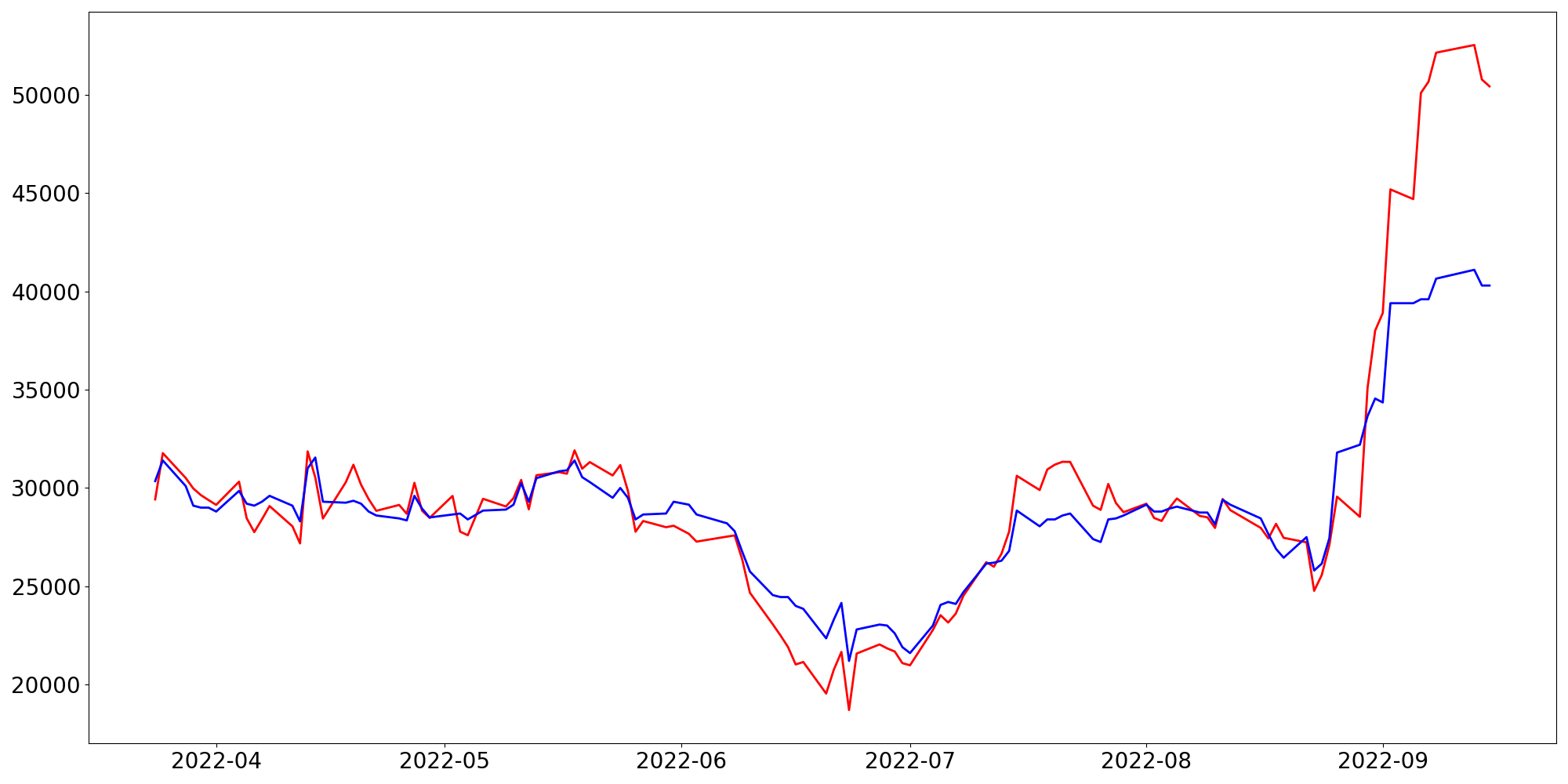 [ - : 실제값(종가) / - : 예측값(종가) ]
