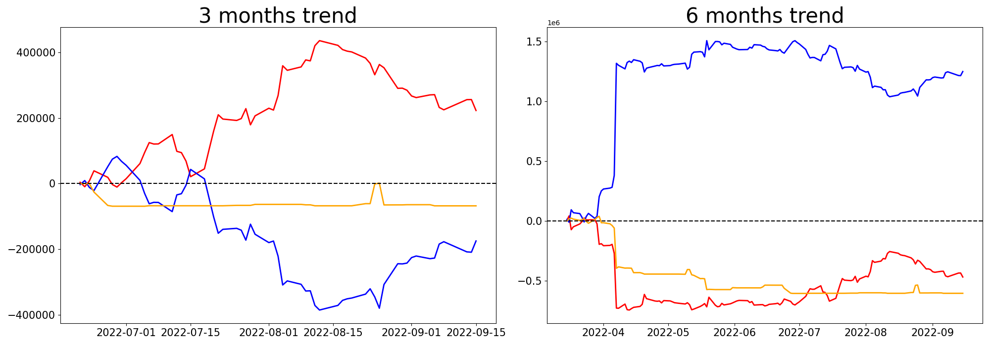 기관, 개인, 외국인으로 분류하여 투자주체별 일정기간동안의 누적적 매수/매도 현황을 분석한 내용입니다. 특정일의 투자자별 매매동향을 통해서 단기간의 시장충격여부를 판단할 수 있으며 장기적인 매매동향을 통해서 해당 종목의 장기 모멘텀을 판단해 볼 수 있습니다.