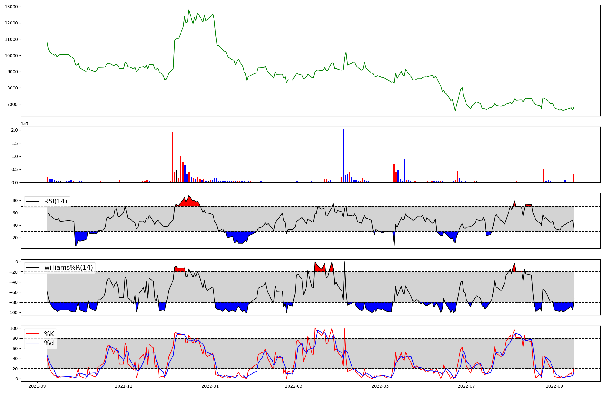 일별 기술적 지표(모멘텀 / 추세 / 시장강도 등)를 활용하여 향후 주가의 움직임을 회귀분석(Regression Analysis)을 통햬 예측해 본 결과입니다.