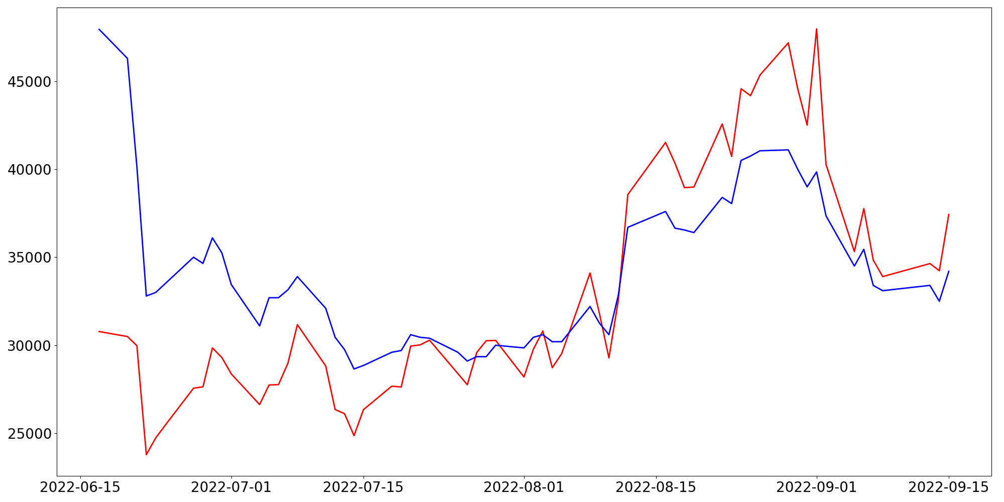 [ - : 실제값(종가) / - : 예측값(종가) ]