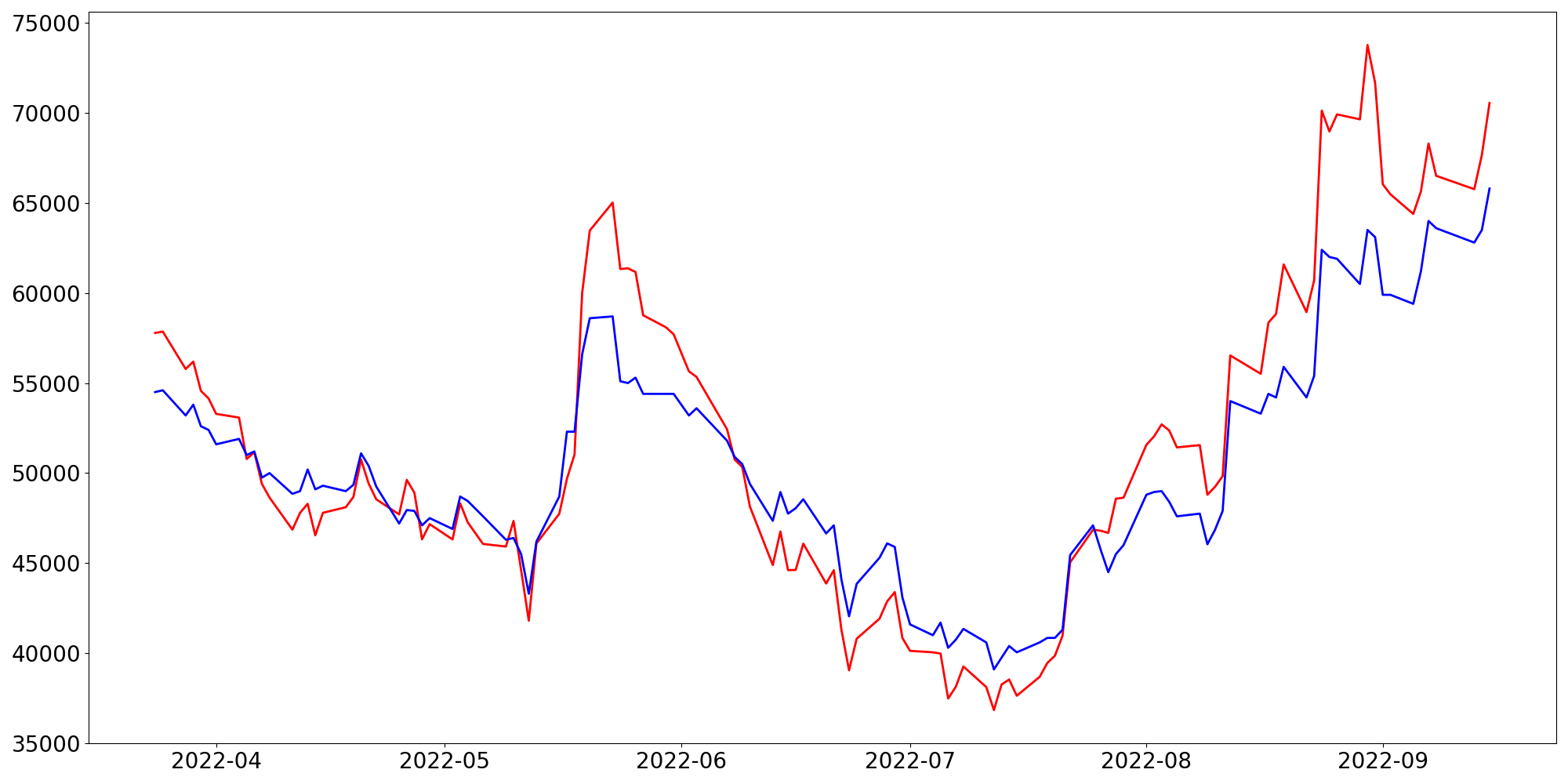 [ - : 실제값(종가) / - : 예측값(종가) ]