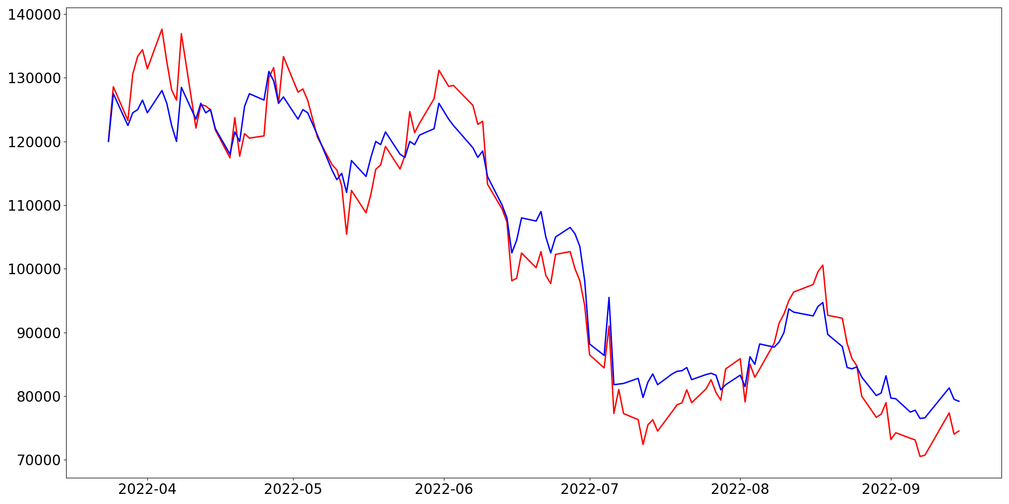 [ - : 실제값(종가) / - : 예측값(종가) ]