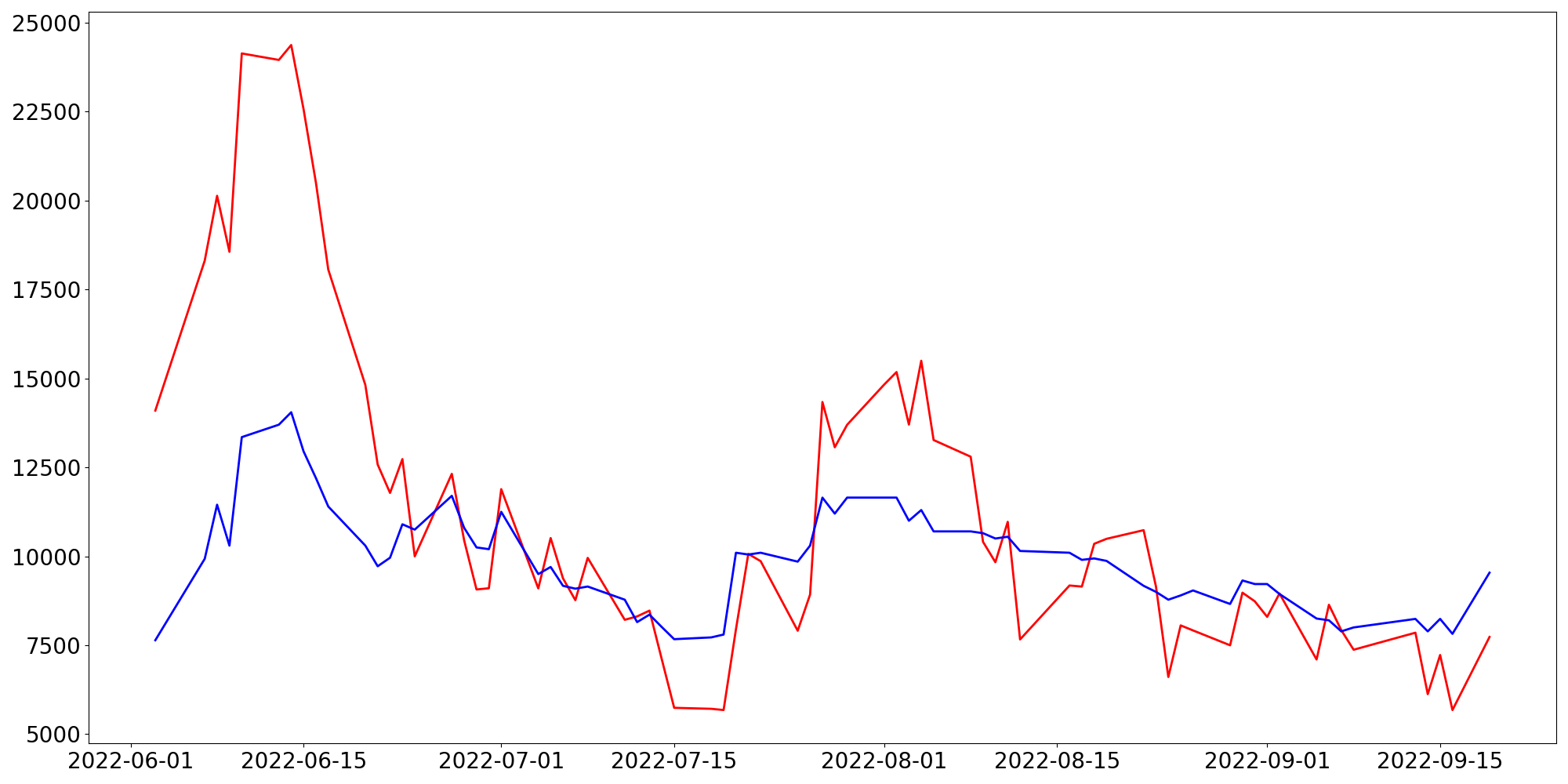 [ - : 실제값(종가) / - : 예측값(종가) ]