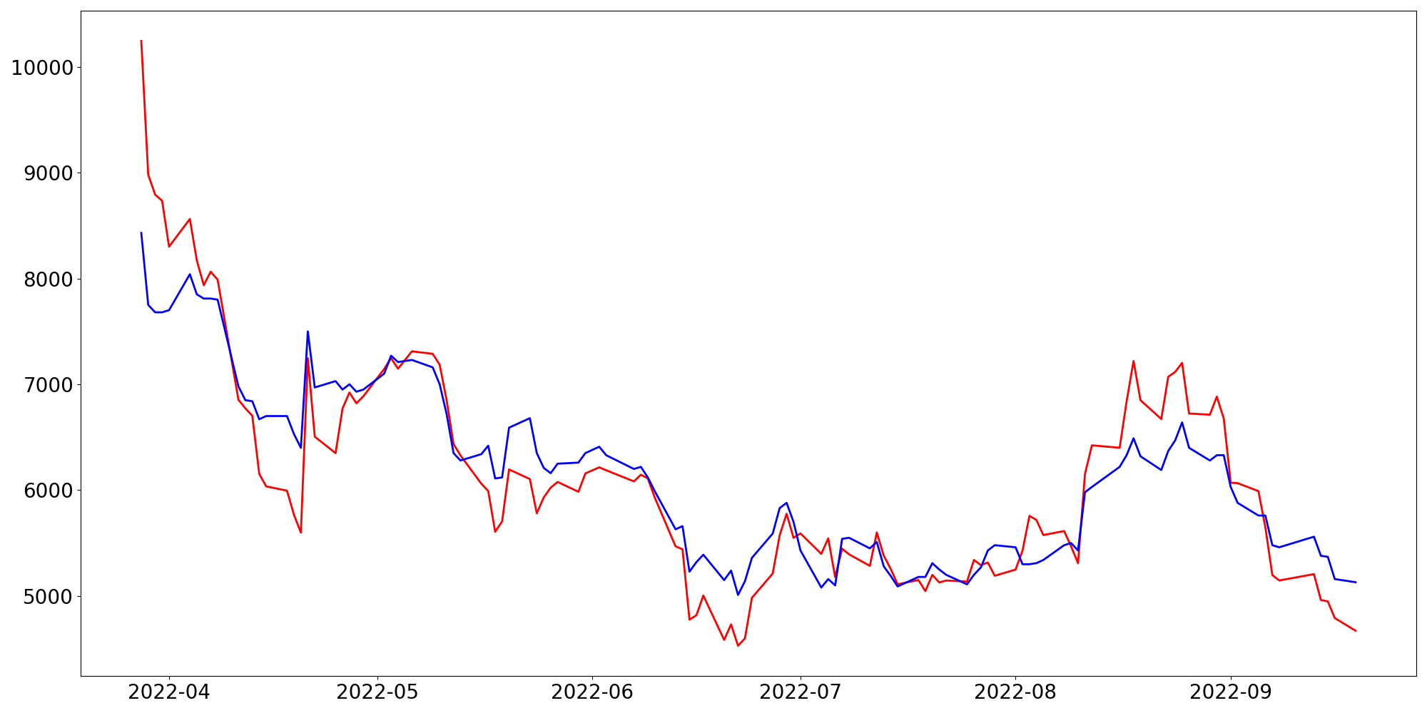 [ - : 실제값(종가) / - : 예측값(종가) ]