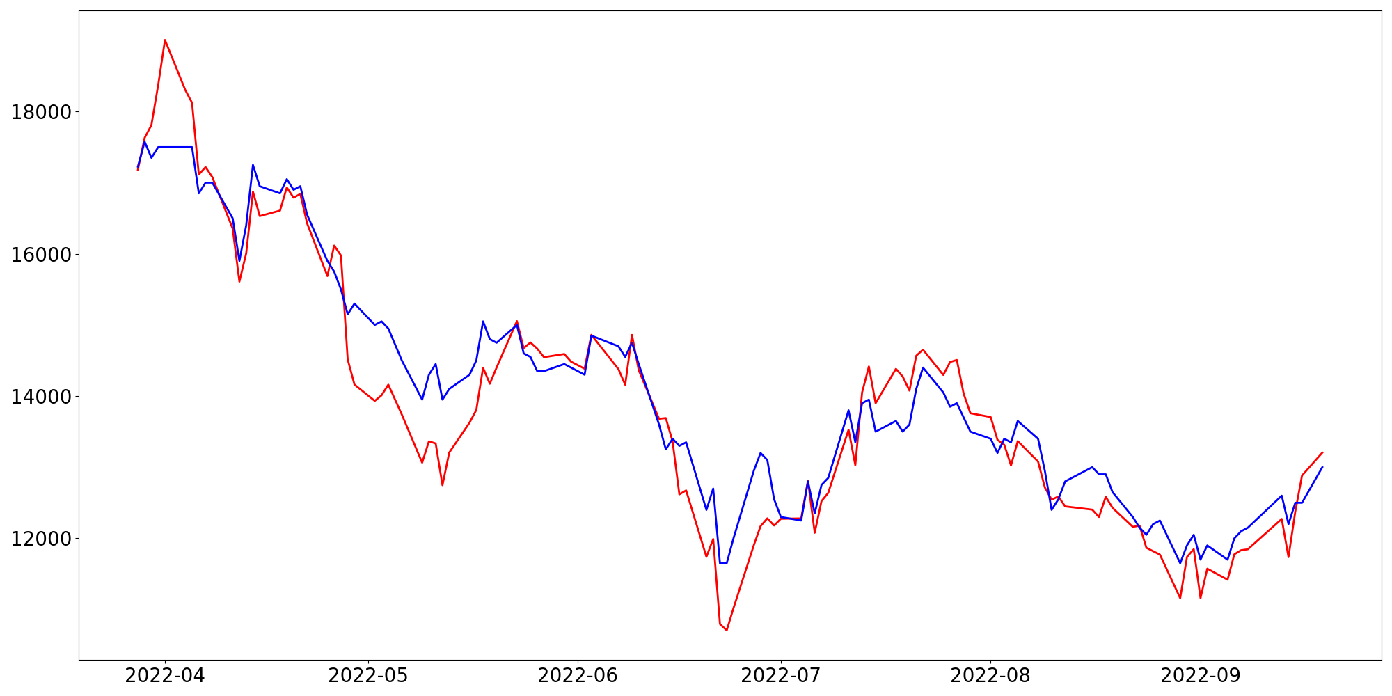 [ - : 실제값(종가) / - : 예측값(종가) ]