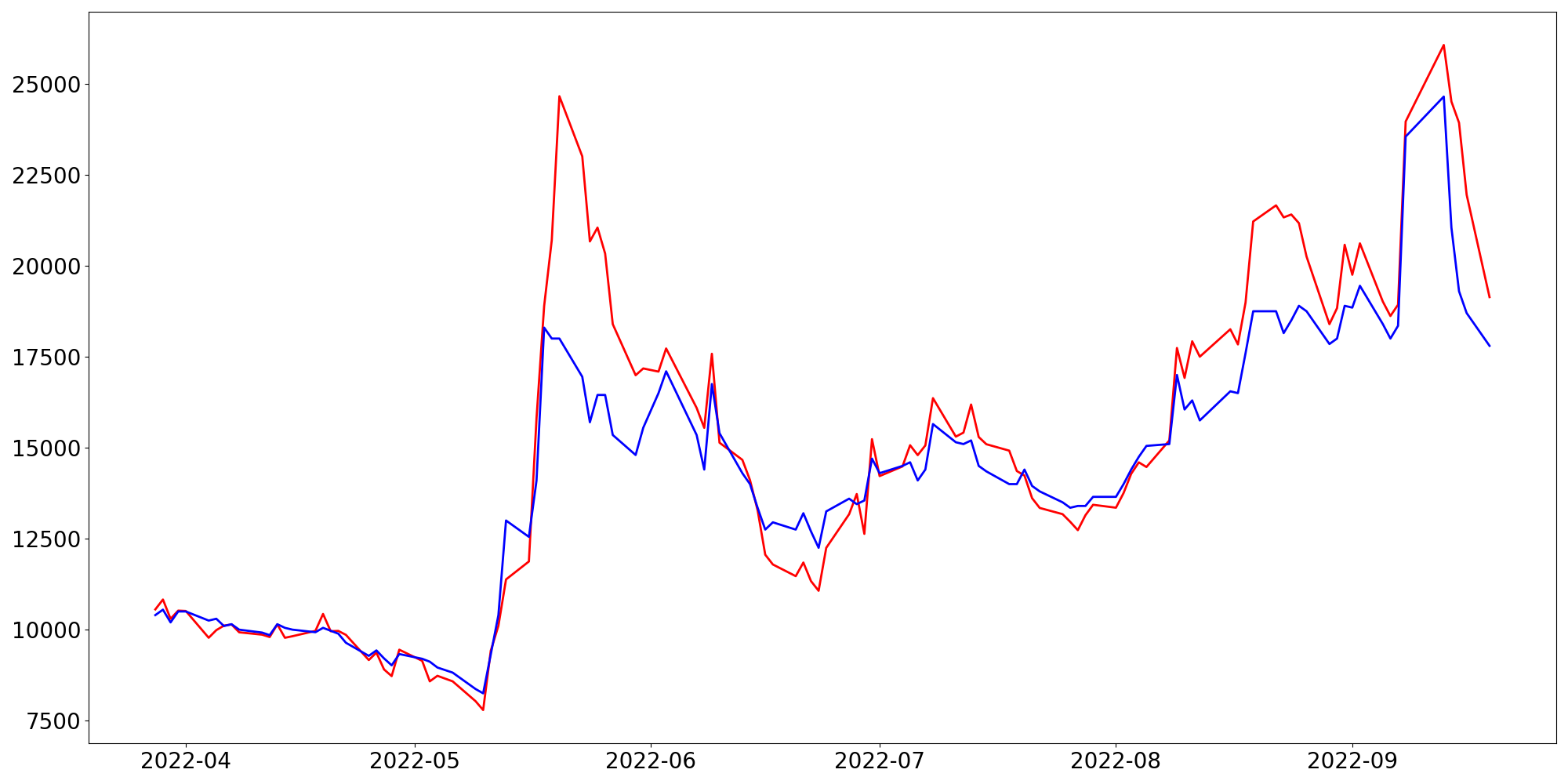 [ - : 실제값(종가) / - : 예측값(종가) ]