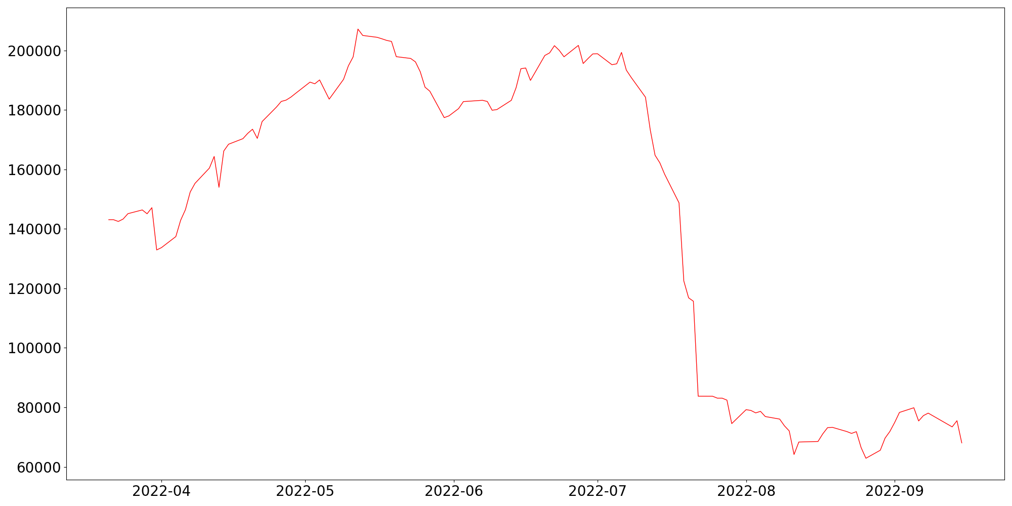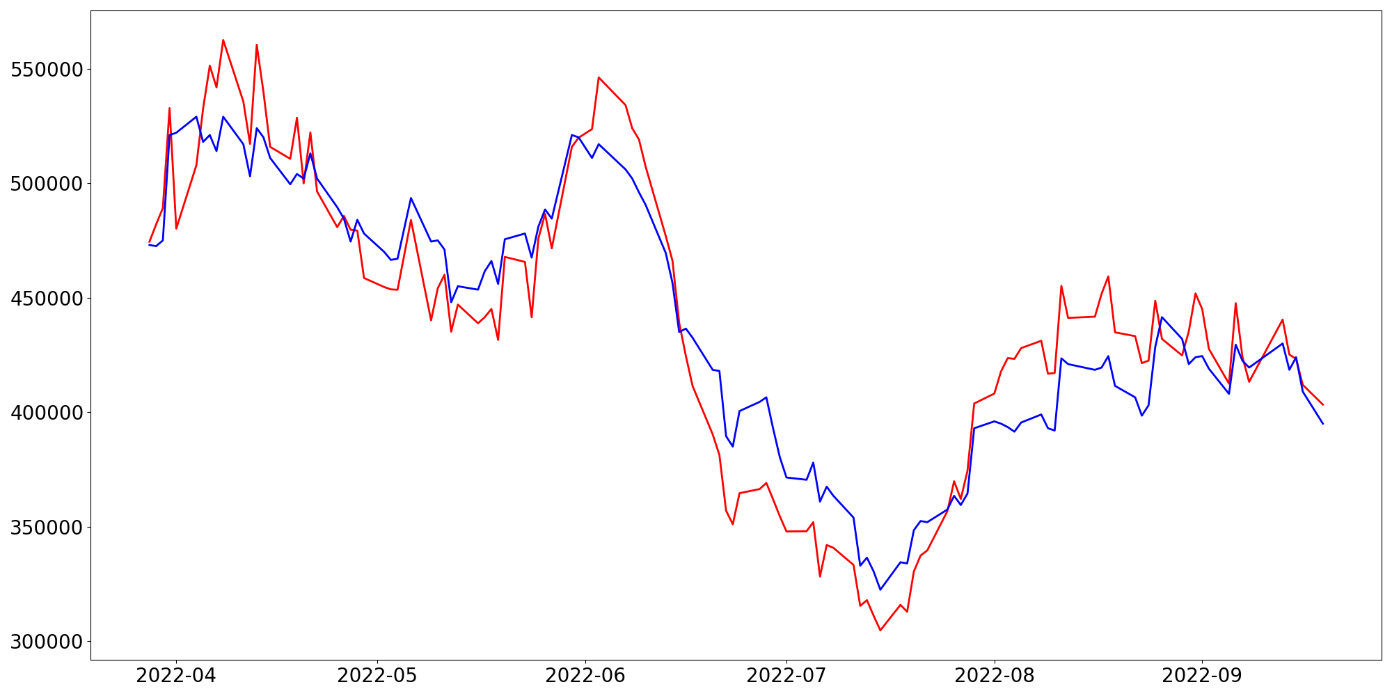 [ - : 실제값(종가) / - : 예측값(종가) ]