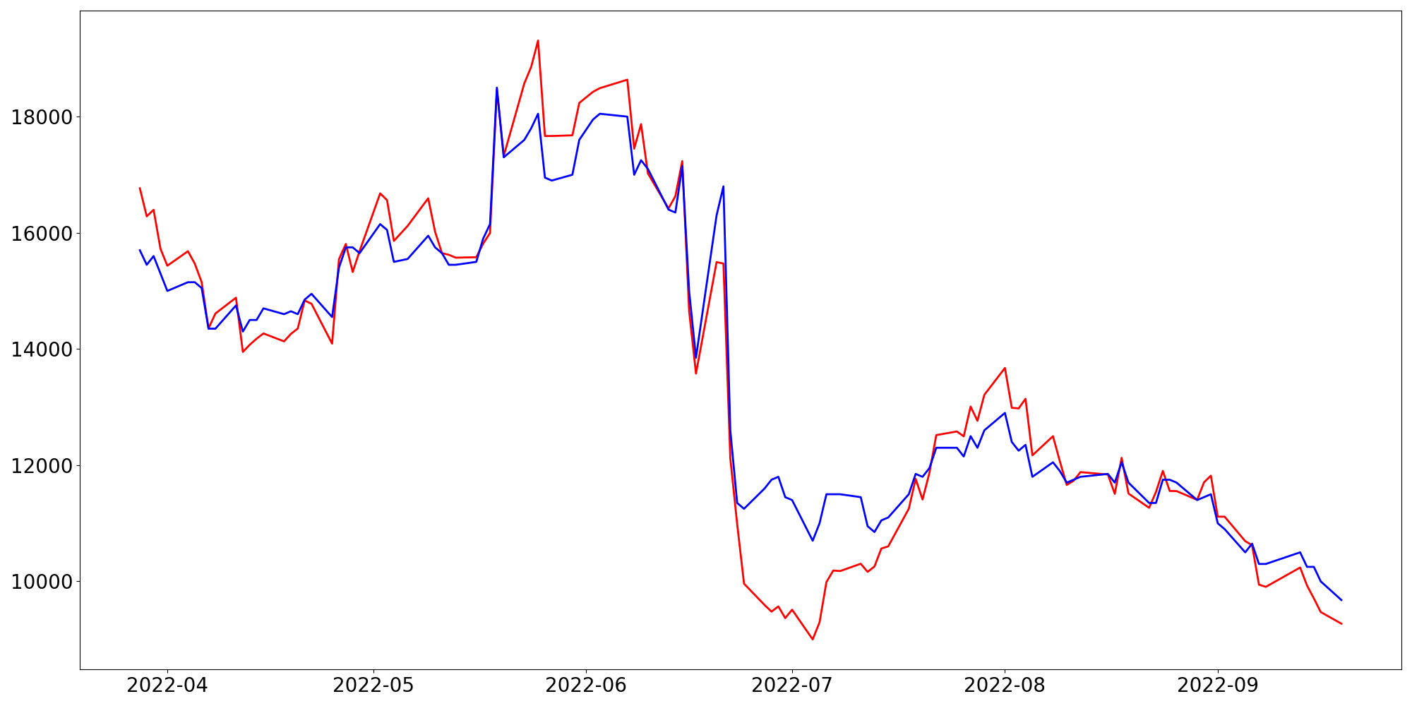 [ - : 실제값(종가) / - : 예측값(종가) ]