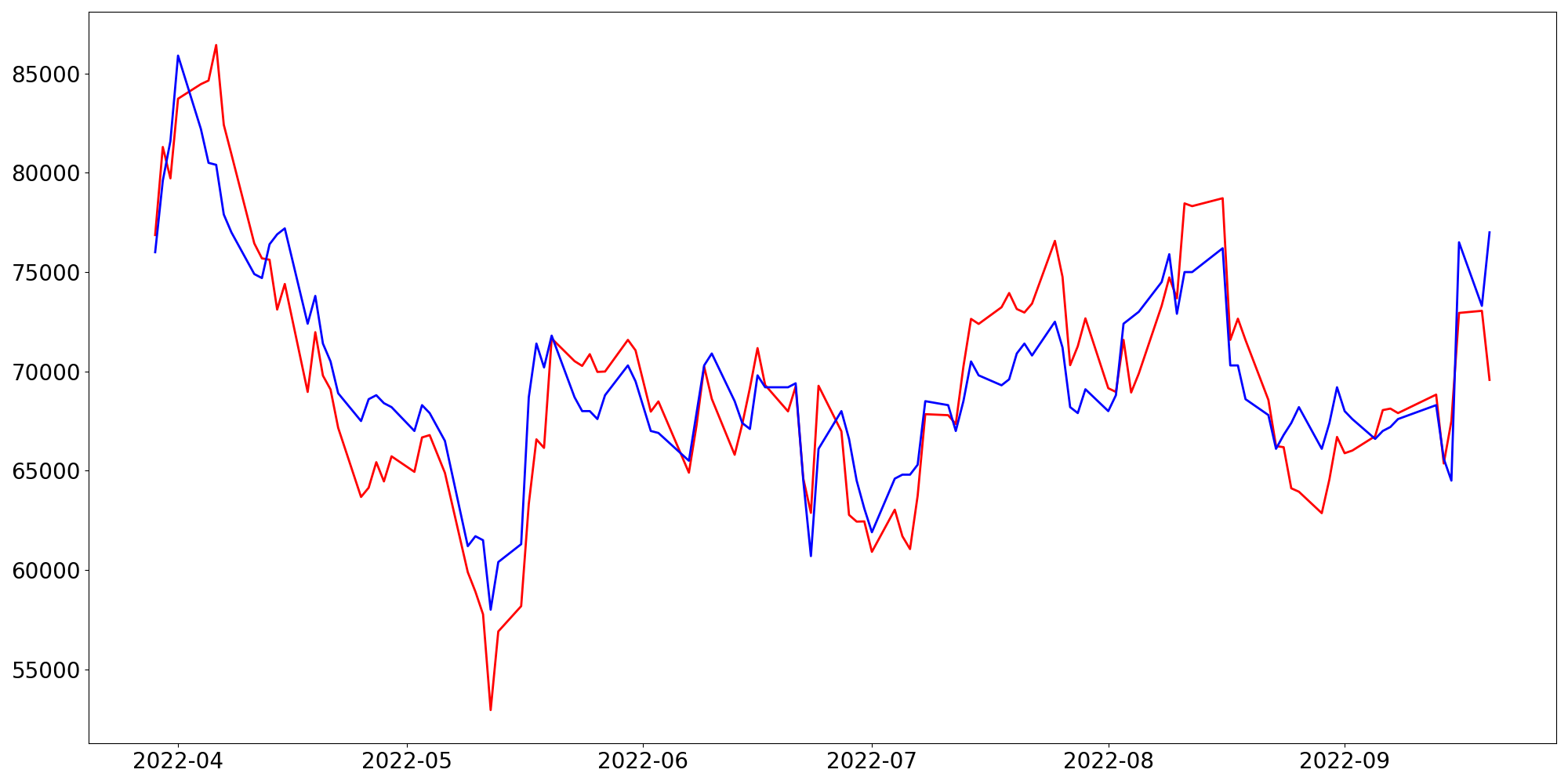[ - : 실제값(종가) / - : 예측값(종가) ]