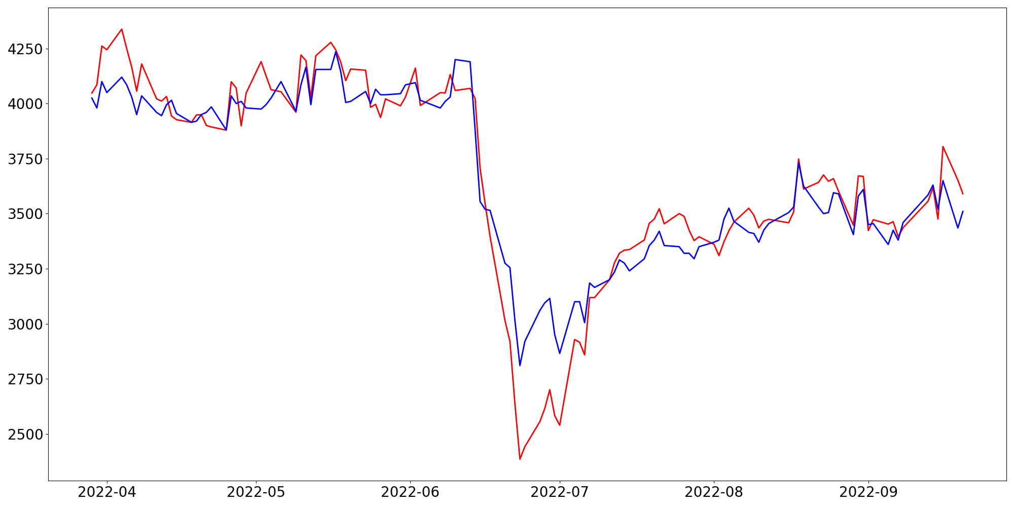 [ - : 실제값(종가) / - : 예측값(종가) ]